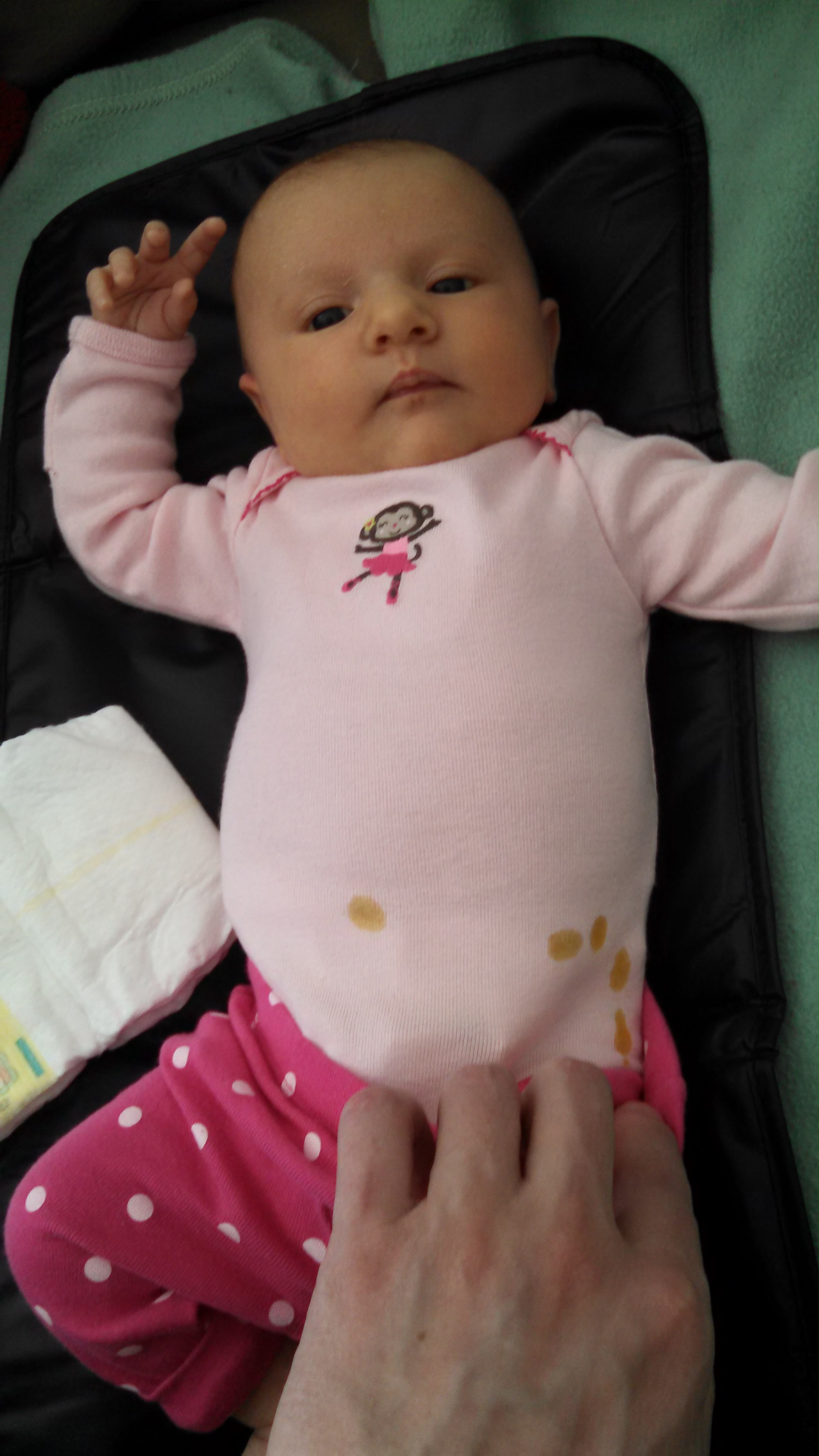 March 7, 2015: My first blow out, and I’m not talking about the hair style. I was home alone with daddy and thought he would appreciate such a spectacular display of pooping abilities. While he did find it funny and a great work of poop art, he encouraged me to keep it in the diaper next time.