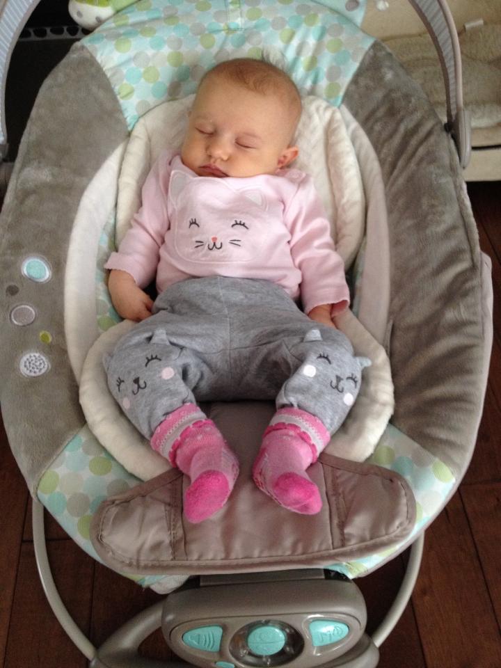 March 28, 2015: For my eight week birthday we went to Target. What an awesome store…I’m gonna love going there more often! I got a carseat toy and a bathing suit for our trip up north, but we really just got pooping supplies. Diapers for me, toilet paper for mommy and daddy, and litter for the cats. Speaking of cats, I got to wear my new cat outfit. So cute! Daddy is worried I’m gonna turn into a crazy cat lady like my mom. We’ll see…