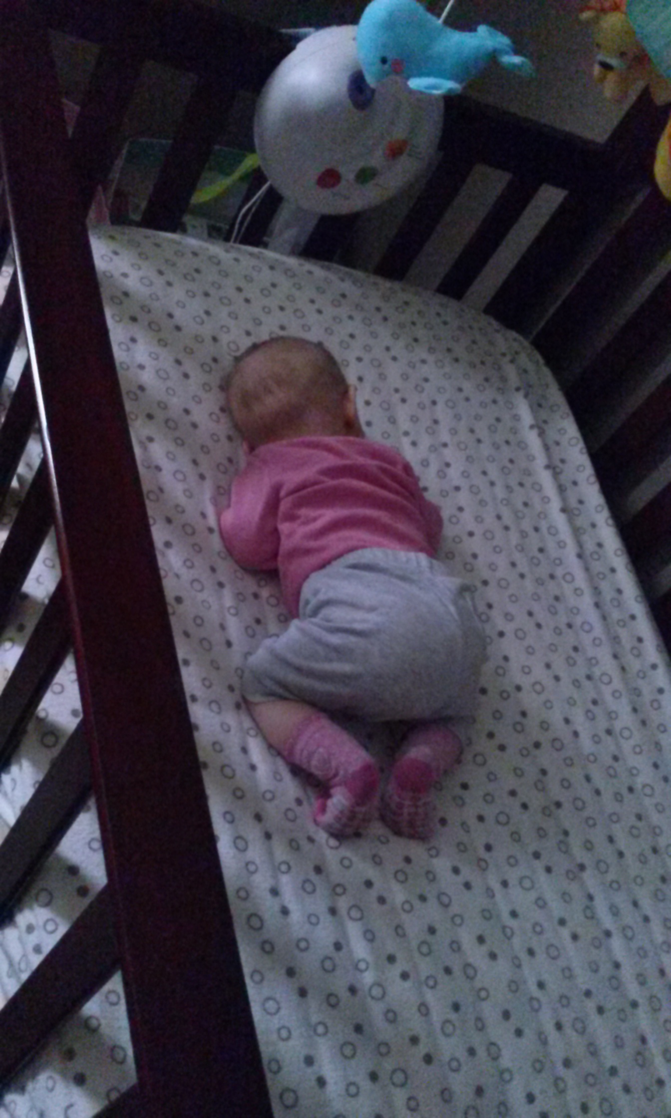 April 10, 2015: I haven’t been sleeping well. Everyone says I’m supposed to sleep on my back, but it’s not comfortable. My hands fall behind my head and I scare myself a lot. Since I’m so strong already, my doctor said I can start practicing sleeping on my stomach. Grammie and I did a trial run while mommy and daddy were at work. She stayed with me in my room and watched me the whole time. It felt good to get some sleep!