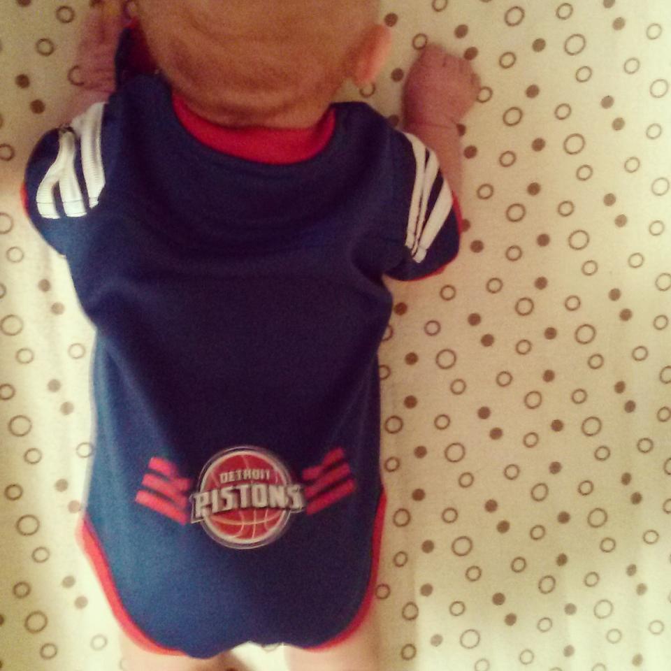 April 13, 2015: It’s getting warmer and lately we’ve been taking more walks or just enjoying the outside. The wind makes me squish up my face and take a deep breath through my nose. I look silly and mommy and daddy laugh at me. Unfortunately, warmer days mean basketball season is ending. I like to watch the Pistons play. They lost, again. Mommy dressed me in my Pistons onesie since tomorrow’s their last game….the season wasn’t pretty but hopefully next year is better!