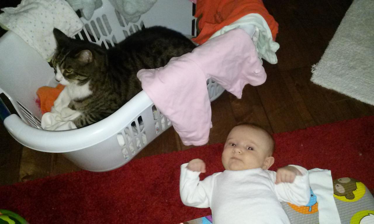 April 17, 2015: …and into the laundry basket. Harley loves me so much he likes to sleep on my clothes. I guess I’m pretty lovable. After lunch mommy took me into town and had a milkshake while I took a cat nap in the park. I didn’t sleep much more the rest of the day and was a real stinker until I finally went to bed at 11pm! I sure like that noise machine mommy and daddy got me, tho. I can’t believe they waited so long.