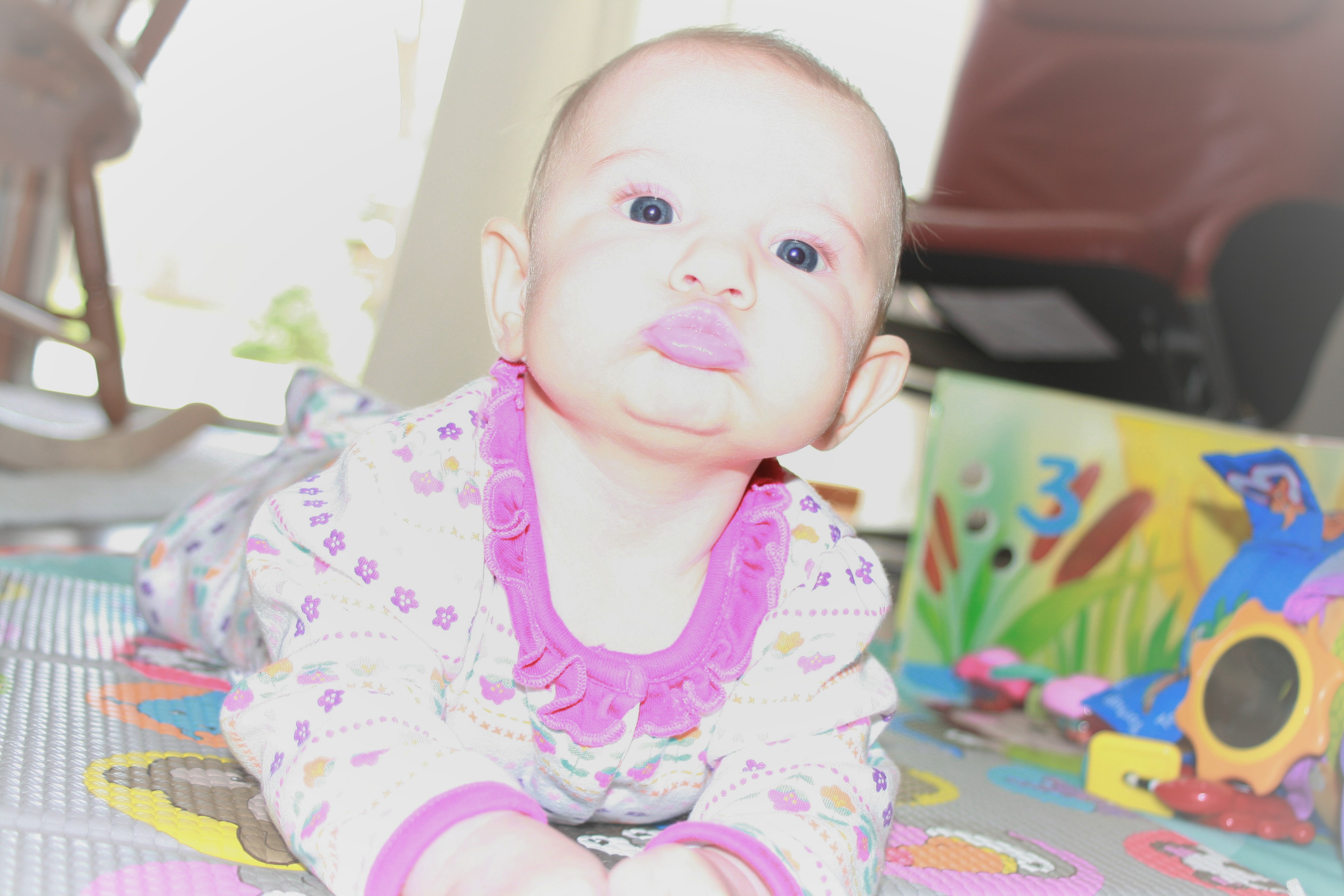May 1, 2015: Mommy had me do a photo shoot today. It was easy. All I had to do was sit there and she kept taking pictures. The flash was a little annoying, but I’m a professional so I managed to keep my composure. Here I am giving my best ‘duck’ face or whatever they call it. In the evening I surprised mommy and daddy and almost rolled from back to tummy. I’ve been practicing and I’m about 95% of the way there. I can taste it…..or is that the carpet?