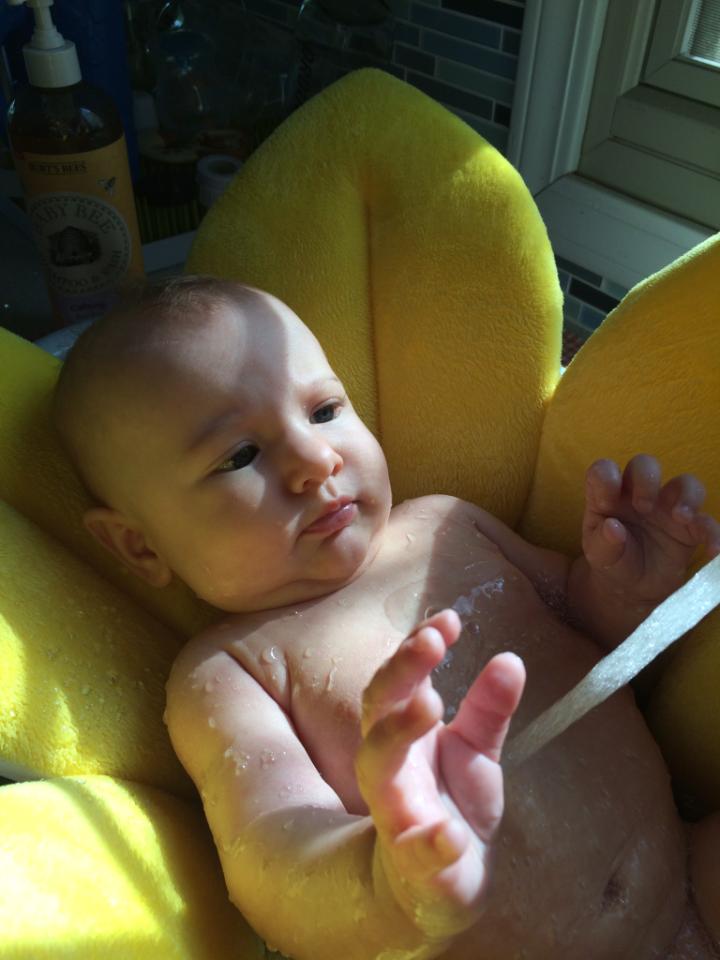 May 13, 2015: …I was takin’ a bath. I love bathtime. It’s a little scary when the water gets close to my face, but I don’t mind. Playing in the water is so much fun. Don’t tell mommy and daddy, but sometimes I purposely spill milk all over myself so they have to give me a bath!