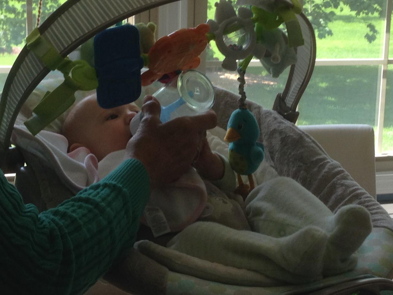 May 14, 2015: I’ve been winning the battle of the bottle a lot lately, so I let grammie win one for a change. I used to take a bottle no prob but I became a food snob and only wanted mommy’s milk a couple weeks ago. Hunger strikes while mommy is at work are getting harder every day. Maybe I’ll let grammie win more often.