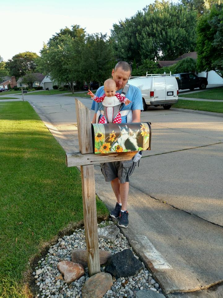 August 3, 2015: There is a special black box on a large stick at the end of our driveway. I help check it everyday. If we time it right, I get to talk to the man who puts paper in the box. He drives a silly looking car. Sometimes he delivers fun paper that I like to chew. I notice other boxes with flowers and animals when we go on walks. There is one that I love because it has cats on it. We always stop so I can pet the cats and say meow! I wish we had cats on our box, but daddy said no……something about only crazy cat ladies have those.