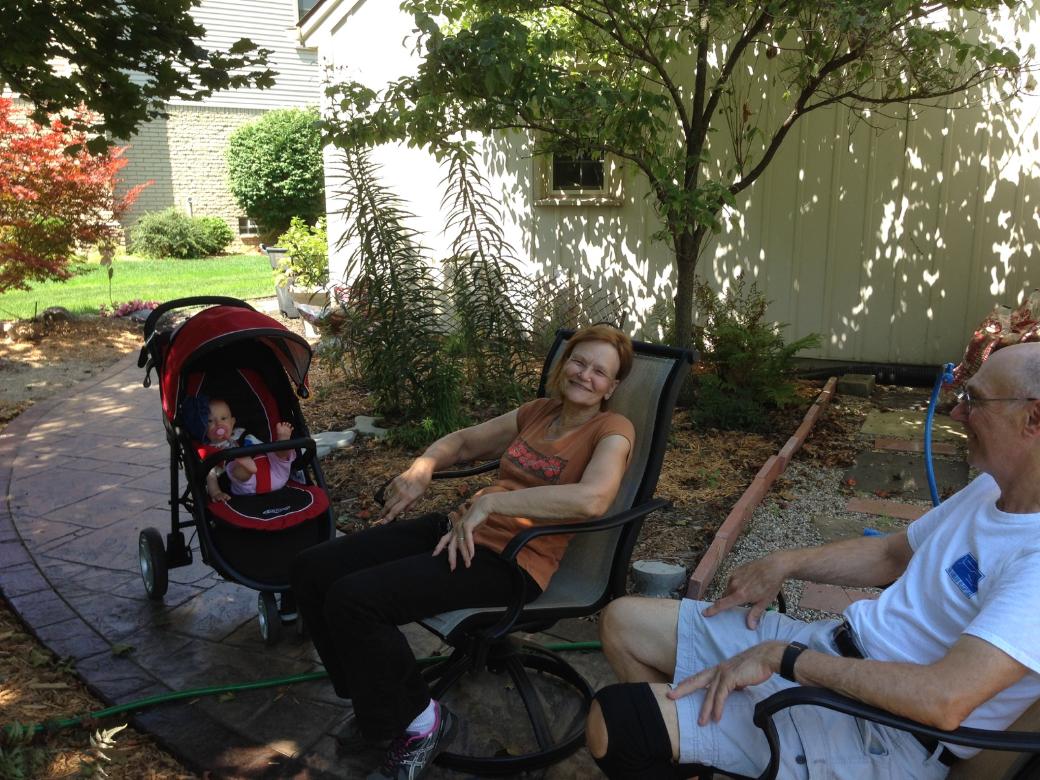 August 13, 2015: Normally I run a pretty tight ship. Two walks in the morning and three walks in the afternoon. No sitting down on the job. Grammie and grandpa have been real troopers and have kept up with my crazy energy level. I gave them a break today. We chilled outside on the patio for a long time. I kicked back with my feet up in my stroller. I could tell by the smiles on their faces that they enjoyed the rest. Don’t get used to this pace you two, I’m a crawling machine now and I want to see what these limbs can do!