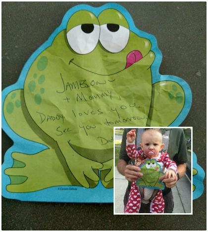 August 19, 2015: Usually in the morning daddy gets me. He says ‘good morning sunshine’, changes my diaper, and then we say ‘good morning’ to the house. This morning mommy got me. She said daddy was away on a work trip and would be back soon. I was disappointed, but grammie and grandpa came over and took me on a walk. Before we left the house I made grandpa check the mailbox. When we opened it, there was a special note inside! It said, “Jameson & Mommy – Daddy loves you. See you tomorrow. Dad.” Daddy, if you are reading this, mommy and I love you too and we miss you a lot. Be safe. Smooches.