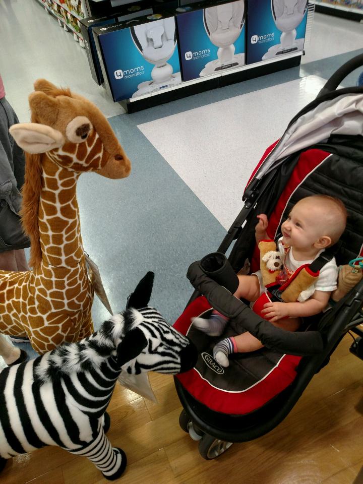 September 5, 2015: I thought I had dreamt that daddy fed me late last night, but when I woke up in the morning he was there! That was no dream! It’s nice to have him back home. We celebrated by shopping for presents for Katie and Melissa’s baby. Mommy says their baby isn’t here yet, but we are going to give him a shower. Babies take baths. Mommy is confusing. The store had my favorite animal, a big zebra! He came over to say hello with his tall friend. I didn’t catch his name because I was so excited. I wonder if zebras take showers or baths? I think his friend takes baths because he is too tall for a shower. But then again, if babies are taking showers I just don’t know anymore.