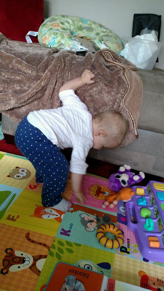 September 25, 2015: I’m going to need a strong core and legs so that I can start walking on my own soon. I’ve started doing new exercises. They are called squats. I throw my toys down on the floor. I bend and pick them up. Then I do it over and over and over. I think it’s working. I can stand all by myself for long periods now! Mommy and daddy are very soft which is nice for me to cuddle on, but I don’t think they are supposed to be that soft…maybe they should do squats with me?! I’m going to check in with Aunt Susie and get them on a regimen.