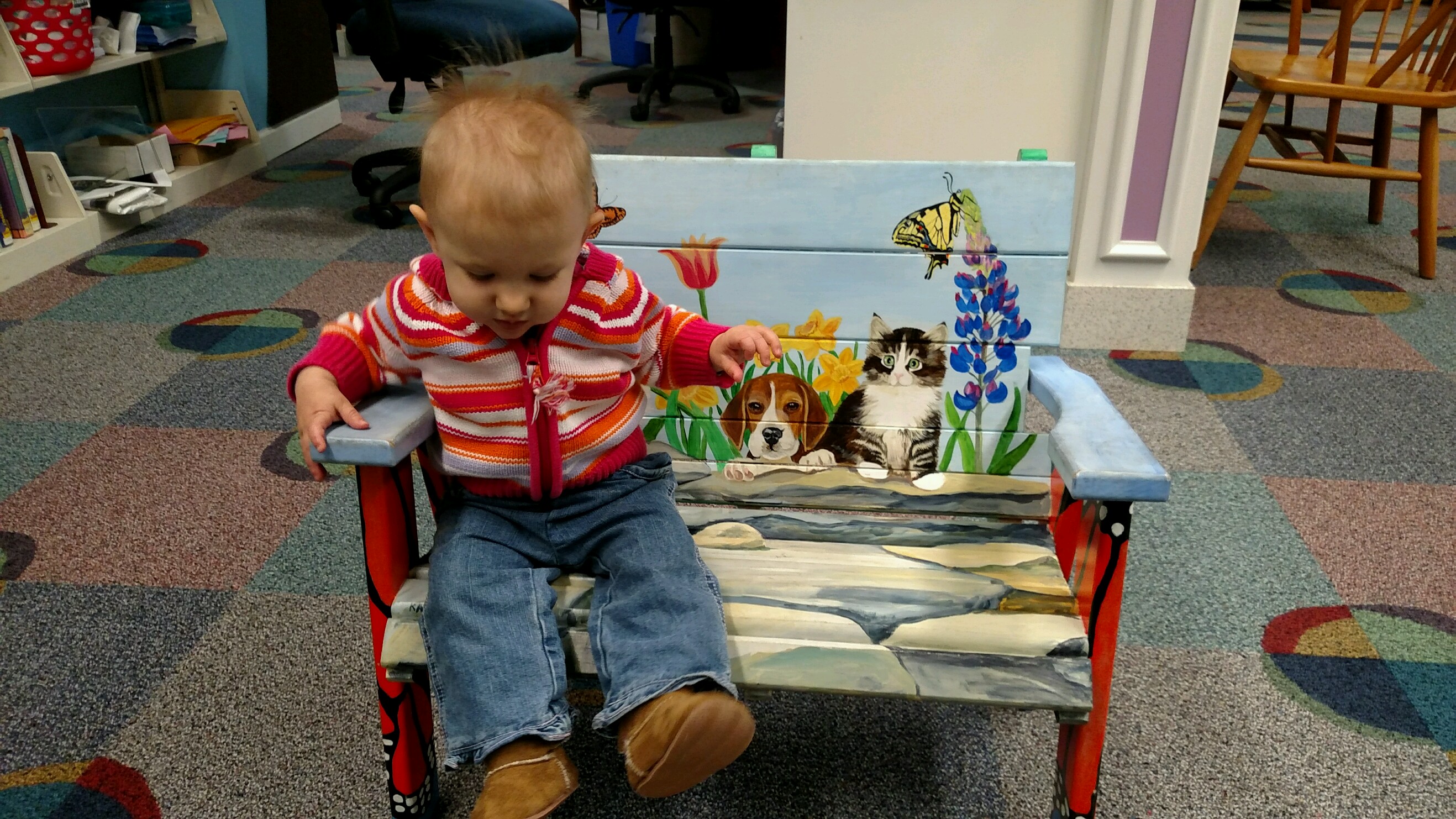 October 23, 2015: Mommy suprised me this morning and took me to a magical place filled with books, puzzles, and puppets. She called it a library. Even though all that was cool, the most amazing part was a bench I found! It had a Harley cat, a Tangy cat, a puppy, butterfies, and flowers on it. All of my favorite things! It was so pretty and it was just my size. I couldn’t take my eyes off it. I gave them kisses and purred. I didn’t want to leave it, but mommy said we can go back another day. I would like to go back tomorrow and show daddy.