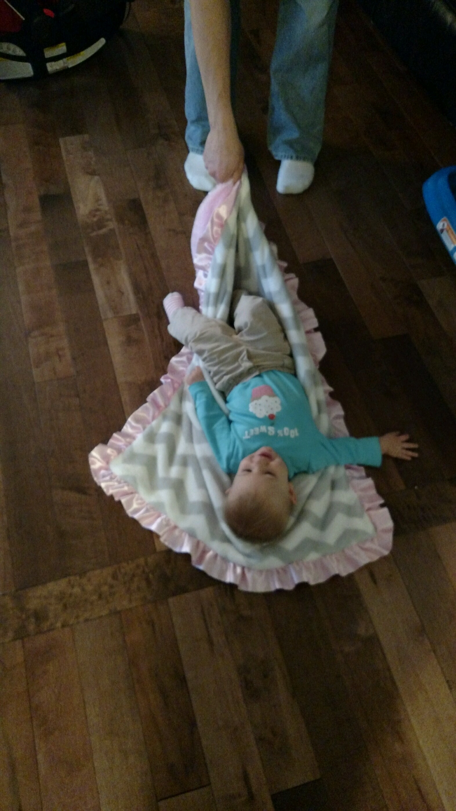 October 30, 2015: I went to the doctor for my 9 month check-up today. I’m doing great! I even weighed enough so we didn’t get in trouble this time. The only bad part was getting two shots. I cried at first, but not for very long. I’m such a big girl now. To celebrate, daddy played a new game with me. He pulled me around the floor on my blanket. It was awesome! I giggled and giggled and giggled! Mommy thought it was a great game too because I dusted the floor….does she ever not think about cleaning and just have fun? Gee, she sure is weird. I was I wish we could play this game everyday!