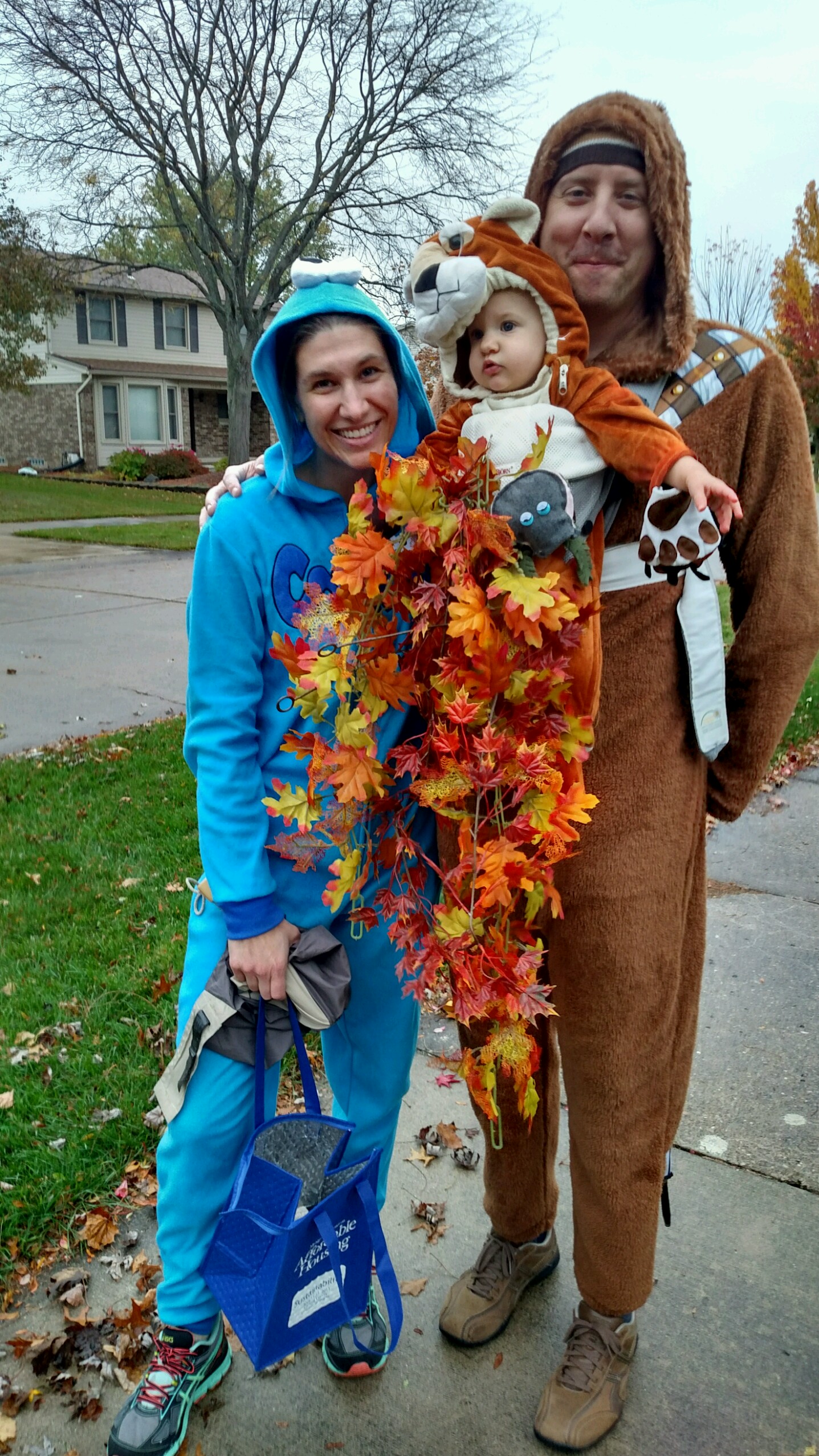 October 31, 2015: A few weeks ago mommy and daddy dressed me up to look like an otter. A few days later daddy came home from the store with a furry, brown sleeper. Mommy has also been wearing her Cookie Monster sleeper around the house, but not at bedtime. I thought maybe mommy and daddy were getting a little crazier than usual. I was really worried today when they got in their sleepers, put me in the otter suit, and we went out for a walk in the rain! Things got out of control when we started going door-to-door begging for candy! I thought the neighbors might ask us to move somewhere else. But as we walked I saw that all the neighborhood kids were dressed up and doing the same thing. I saw kids dressed like superheroes, star wars characters, princesses, witches, pokemon, and a hotdog on a scooter! Phew, I didn’t look silly at all! Mommy and daddy, on the other hand, looked ridiculous.