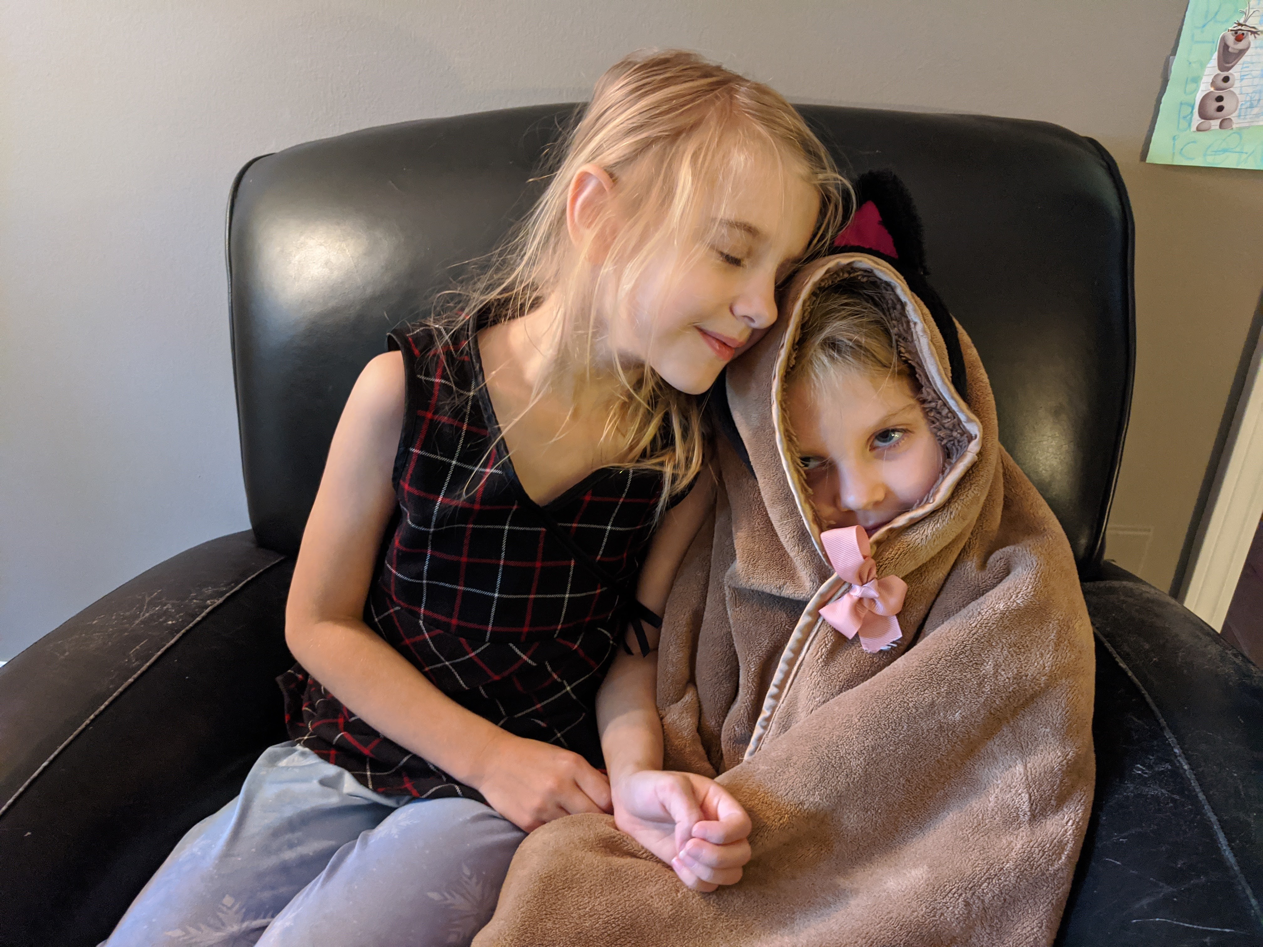 September 28, 2020: Jameson and I really like cats. Harley is great and we love him, but he’s not willing to accept the size of hugs we’d like to give him. So that leaves us with hugs to give and no one to take to them. That’s when my super smart sister takes action. She dressed me up like a cat and hugs me! Perfect.