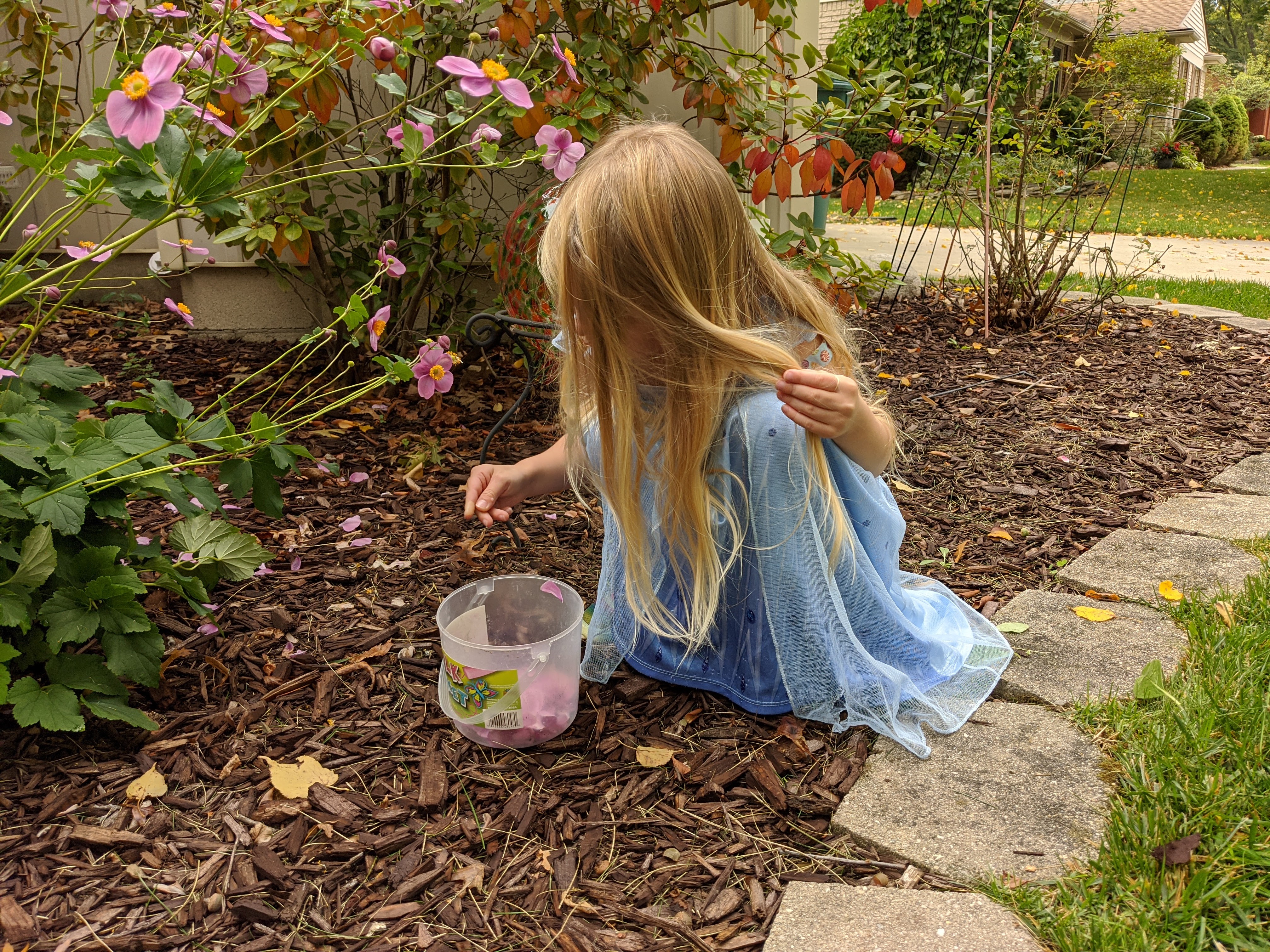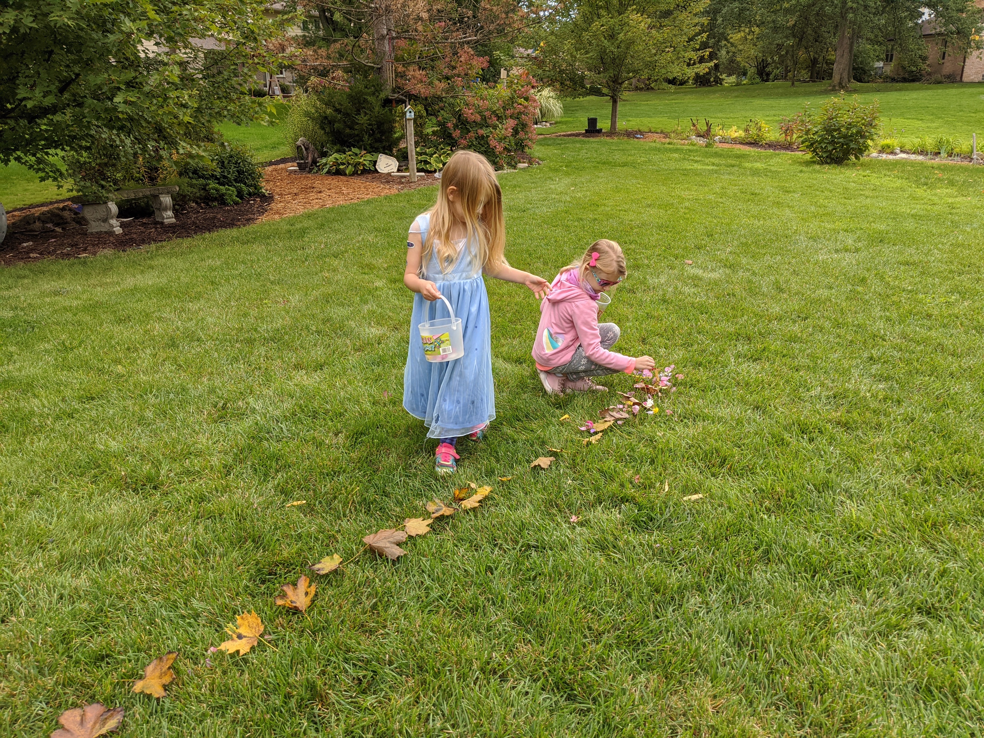 September 29, 2020: Finley needed a trainer to help her get in flower girl shape. I put her through the wringer today. We picked flower petals to strengthen her picking muscles. I laid out leaves to keep her in a straight line. I made her throw and sprinkle to perfect her technique. She’s almost ready. We just have a little more work to do.
