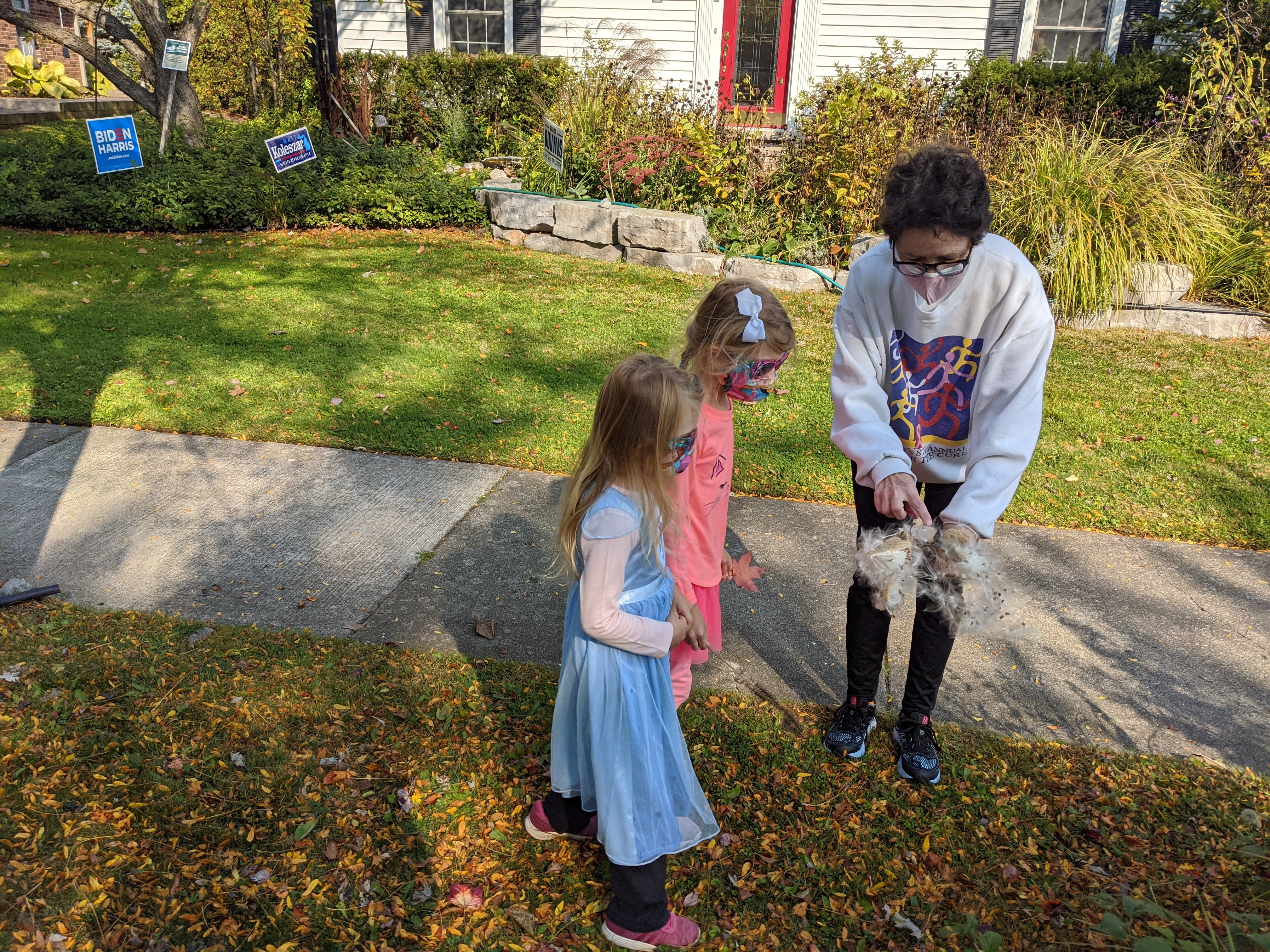October 9, 2020: Seeing our friend Winnie is one of our favorite parts of the day. Usually we just see her out walking around the neighborhood and we wave and say hi. This morning was special though because she let us walk through her rain garden! We learned a lot and then she gave us milkweed seed pods. The seeds were so soft and so silky. She told us to let the wind spread them so that more milkweed plants can grow and help the monarch butterflies. Done and done.