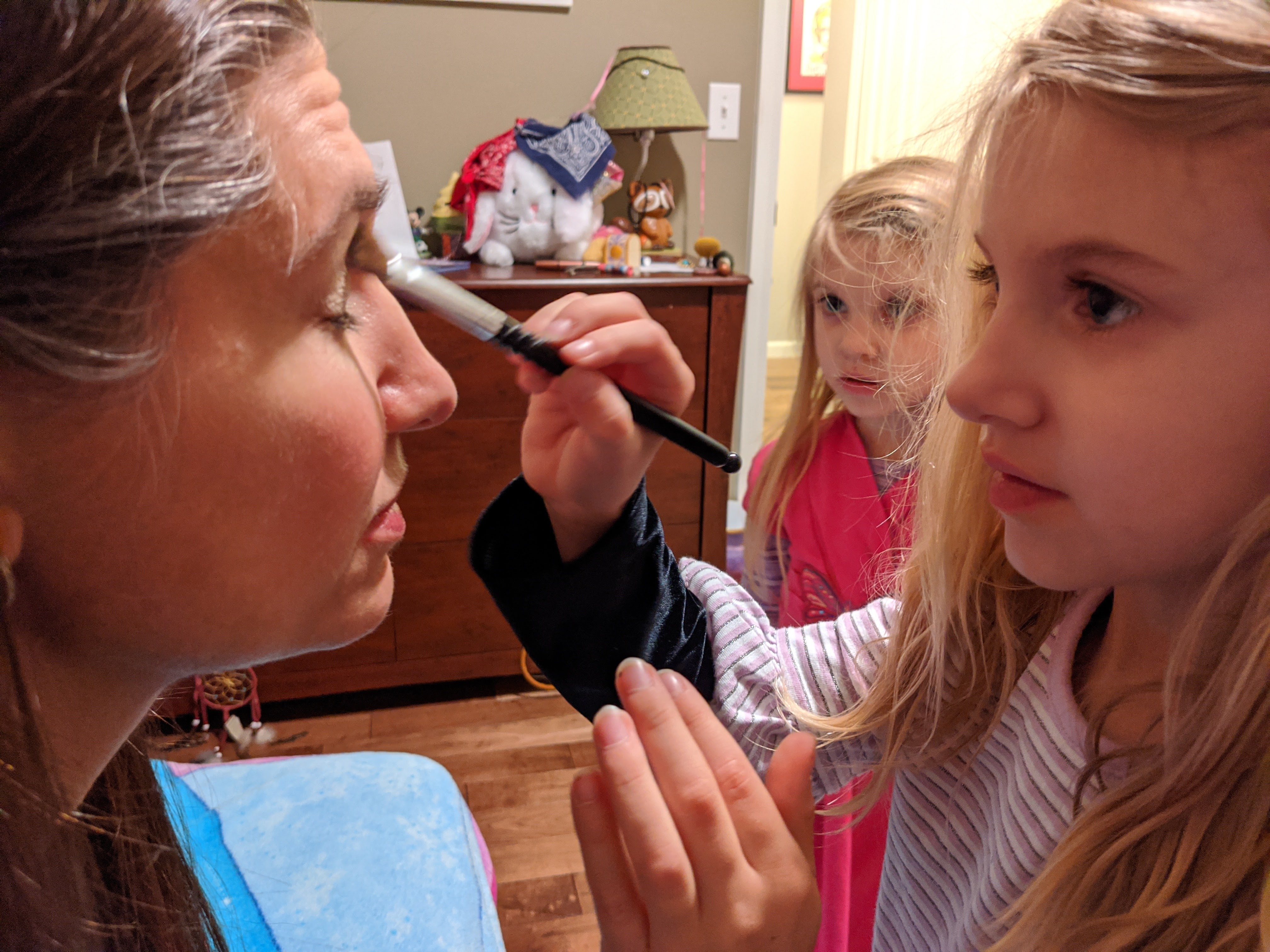 October 19, 2020: We finally got to the fun stuff at school today. We always learn a lot from just watching mommy. But if we wanted to learn how to put on makeup by watching her do it, we’d have to wait years. Mommy puts makeup on every three or four years. Finley is four. This is very new to her. It was a good, hands on lesson. Now I think I’m ready to practice my my skills on Finley.