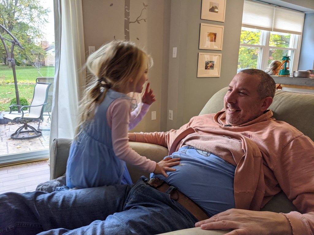 October 25, 2020: Shhhh. I know how to make the Lions win. I rub daddy’s belly while he watches the game and then I put on my jersey for the last minute. Game over. Lions win!