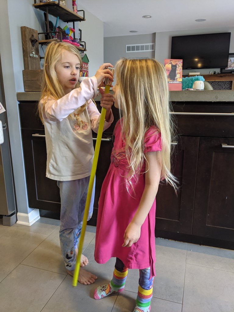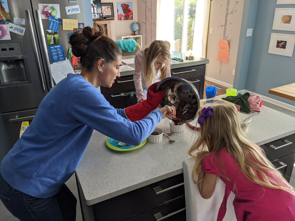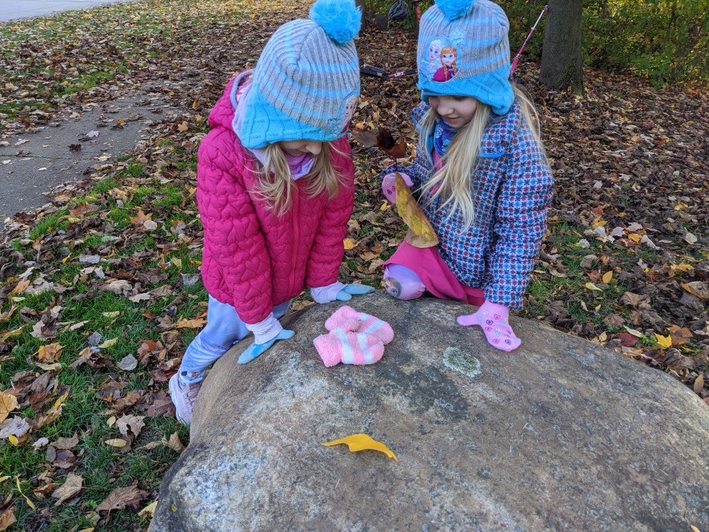 October 28, 2020: We got to do a few science experiments today – a tasty one, a tall one, and a mystery one. For the tasty one, we used melted chocolate on ice cream to learn about igneous rock. Just like Ta-Ka in Moana! That was delicious learning. For the tall one, we used a measuring tape to see how tall Finley and I have grown. We’re growing like crazy! For the mystery one, we had to use our brains big time! We went out on a walk looking at different types of rocks. During our field trip, Finley lost her mitten but we didn’t know where. I had a good idea! We can retrace our steps and eventually we’ll find it in the last place we look! And guess what? It worked!! The mitten was right there on a rock! Luckily, we brought the other one to make sure it was a match.
