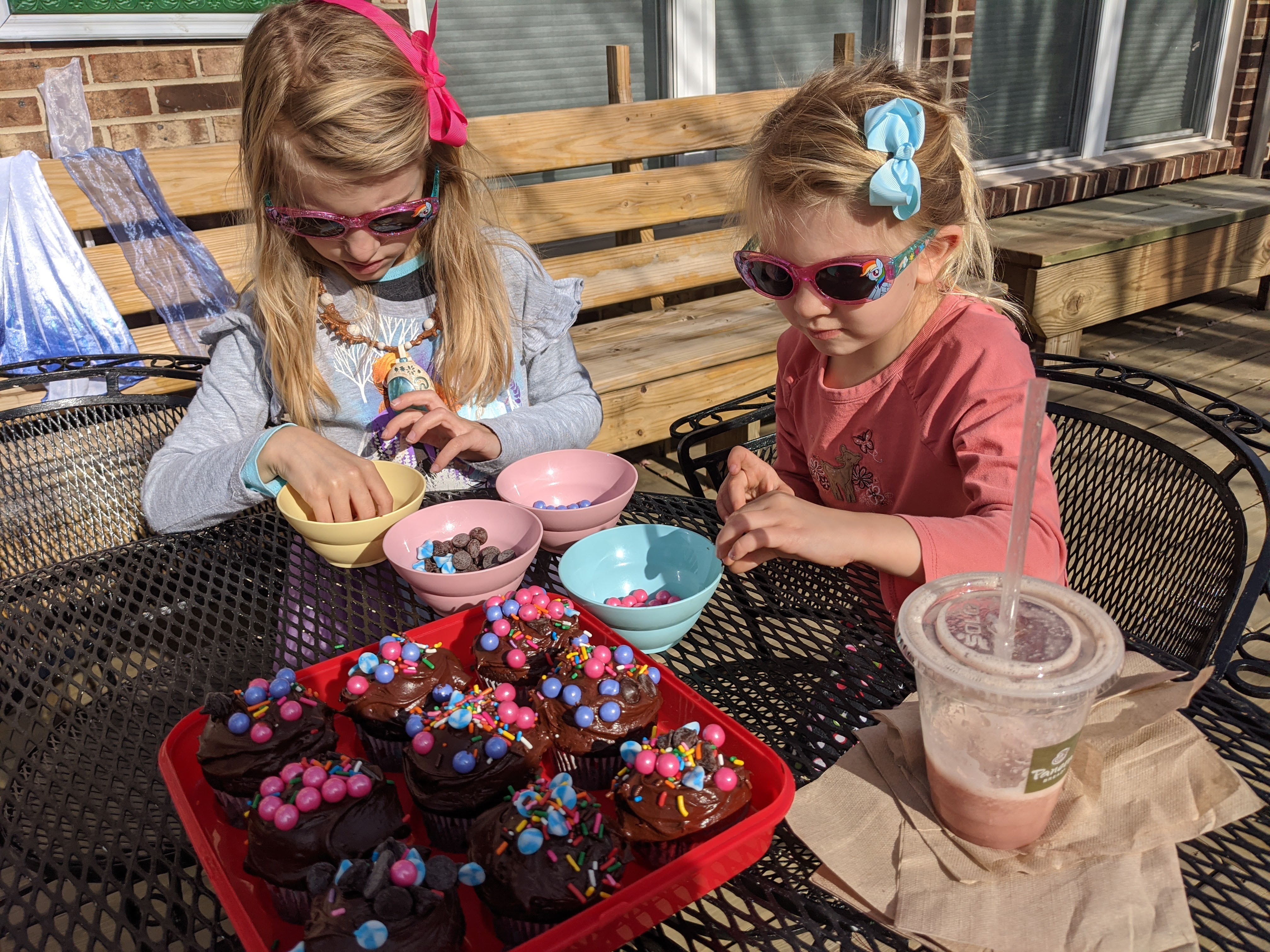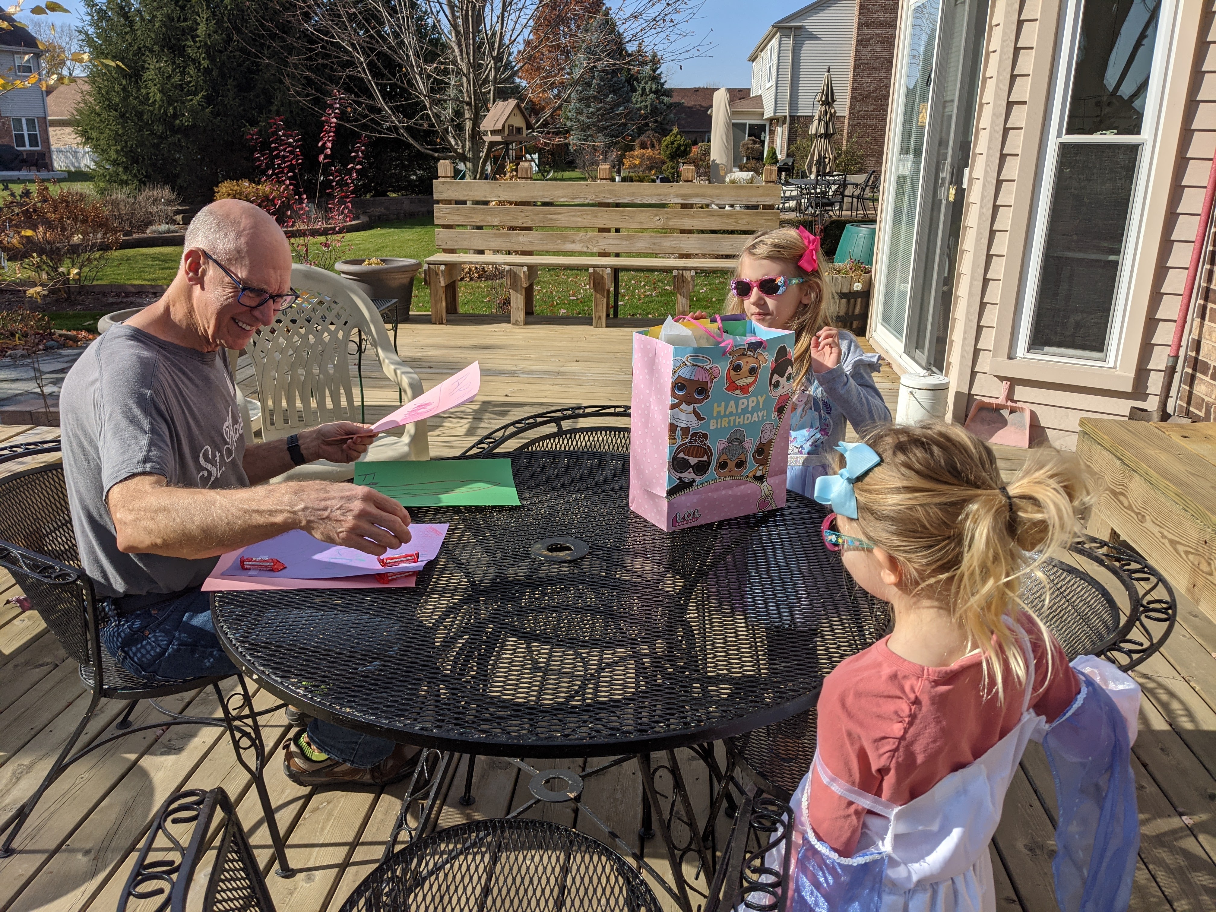 November 6, 2020: We are so sick of celebrating birthdays during sick week, but we are making the most of it. Today was papa’s day. I made a checklist: present, cards, balloons, cake, $0.72, and Frozen outfits. We took all morning to get everything ready. Mommy let us skip school again. Thankfully the day was warm and sunny so we had a wonderful outside picnic to celebrate. Grammie took care of the cake and cupcakes and we decorated them! YUM! If there is a silver lining to sick week, we are really perfecting our party planning skills.