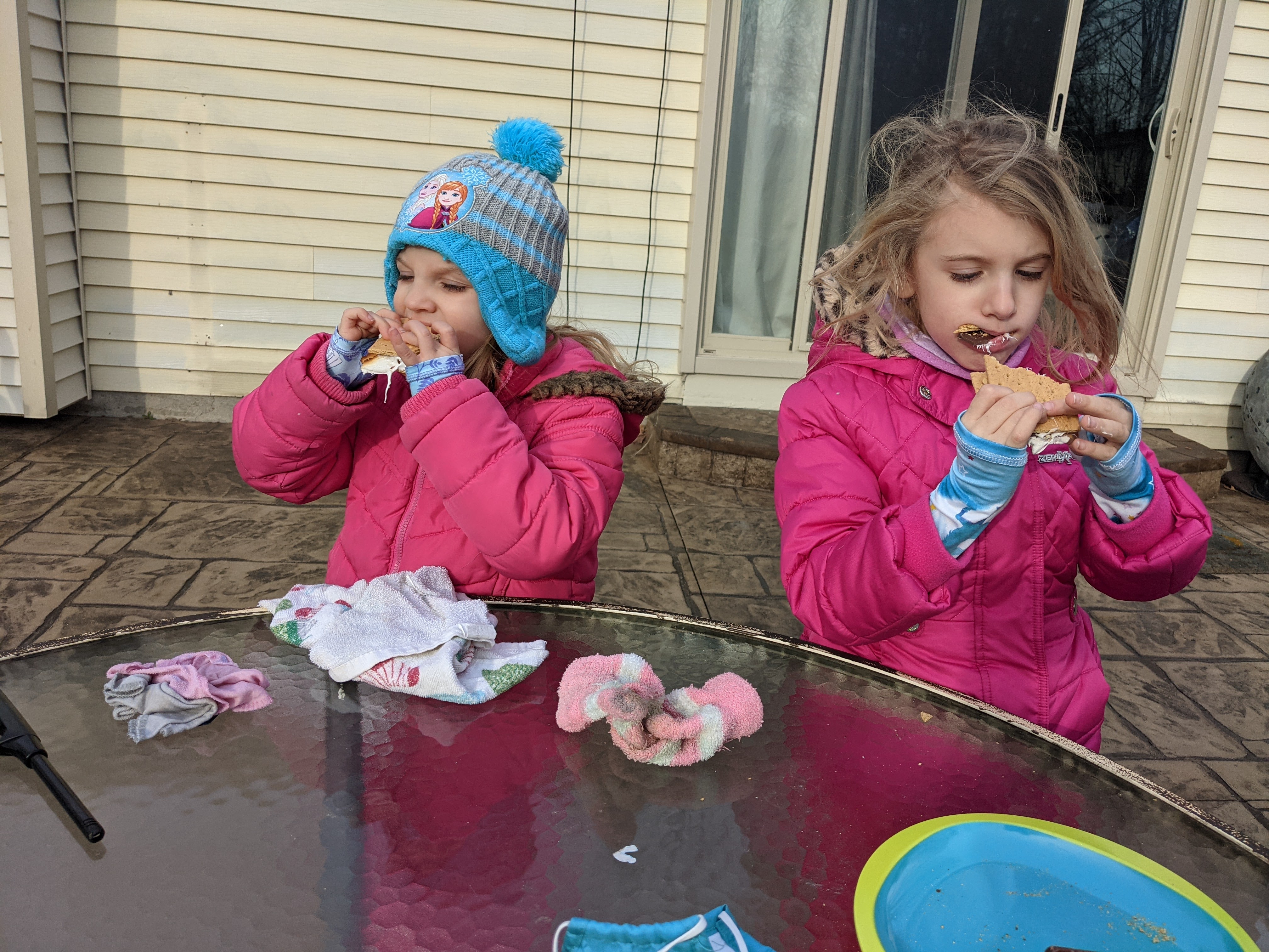 December 29, 2020: Yup. Daddy is a genius. Who else would suggest we put on our snow pants, go outside, make a fire, and roast marshmallows in the winter?! Yeah. That was a great idea. The s’mores taste even better in the cold.