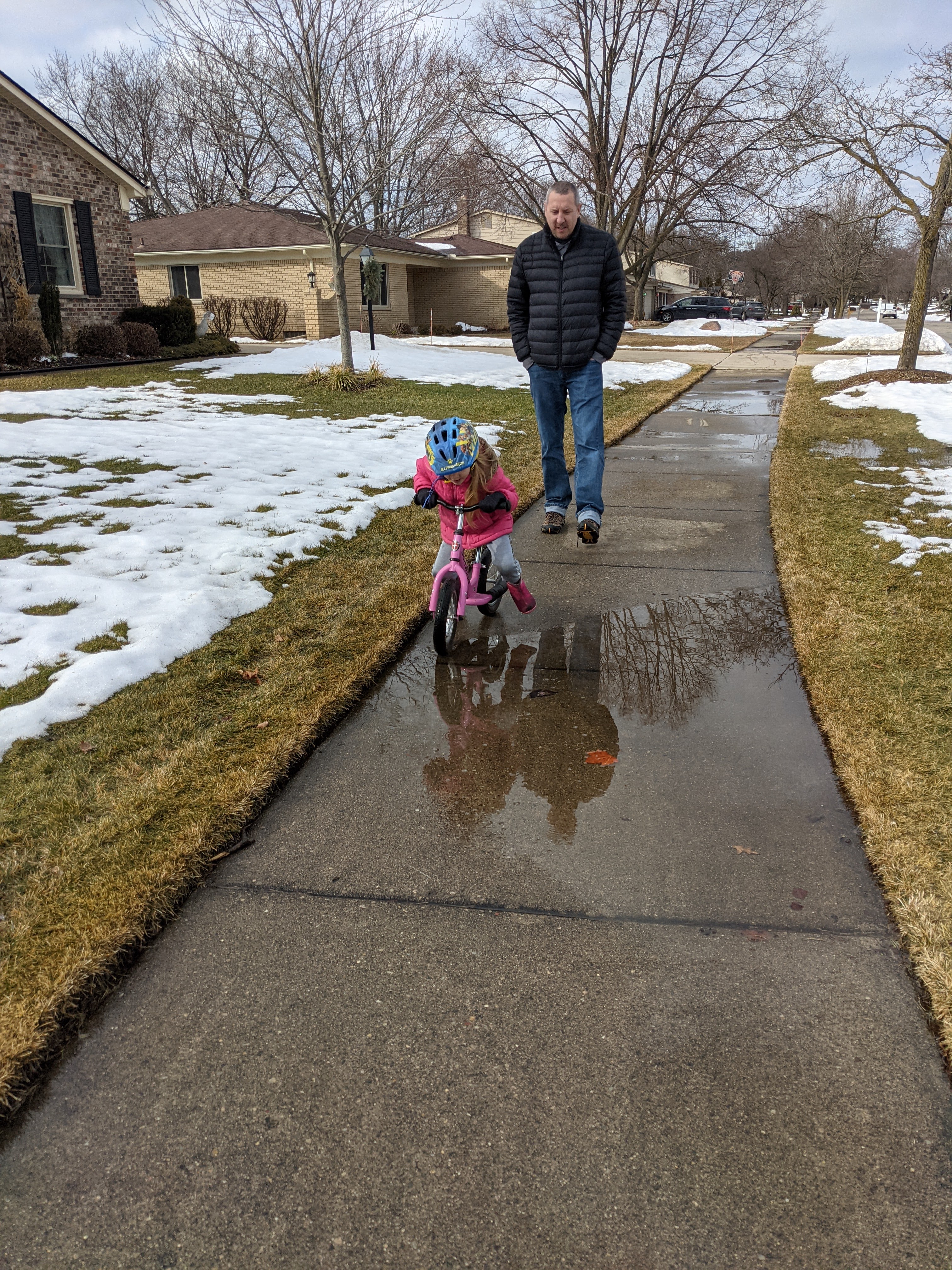 February 28, 2021: Woah! It was so cold and now it’s getting warmer outside. Today it almost felt hot! The melting snow gave me puddle challenges on my balance bike. Just what I needed to help me practice. I’m really loving this balance bike stuff. I wonder why I didn’t like it in the fall?! Maybe not enough puddle.