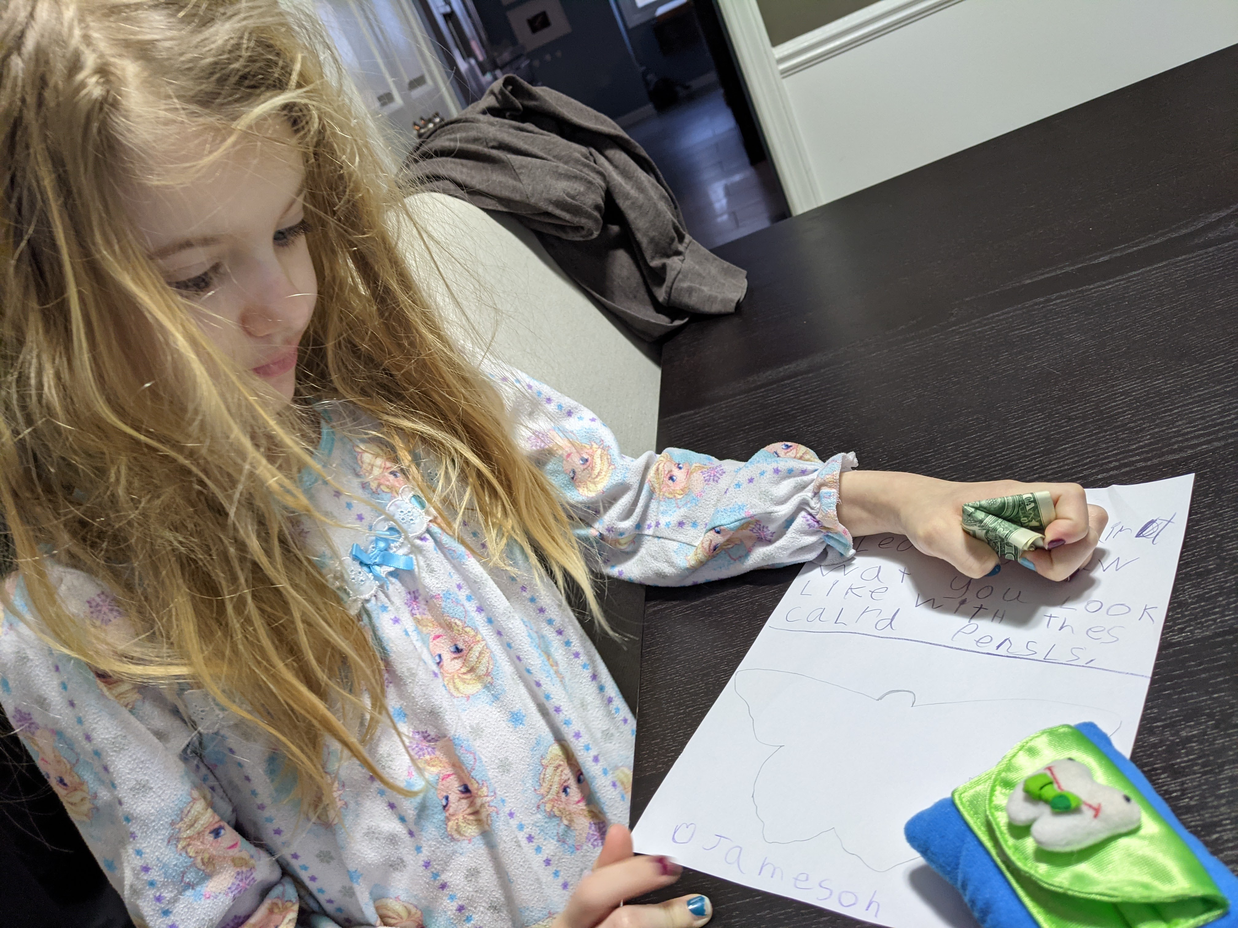 March 8, 2021: I think maybe the Tooth Fairy charged me $2 for her picture. For my first tooth she gave me $5. I thought I’d ask her to draw what she looks like when she picked up my second tooth. This morning there was an outline of a fairy on the paper, but I only got $3 for my tooth! 5-2=3. I’m good at math so I know the picture cost $2. Since I’m good at math I also know I can sell it for way more.