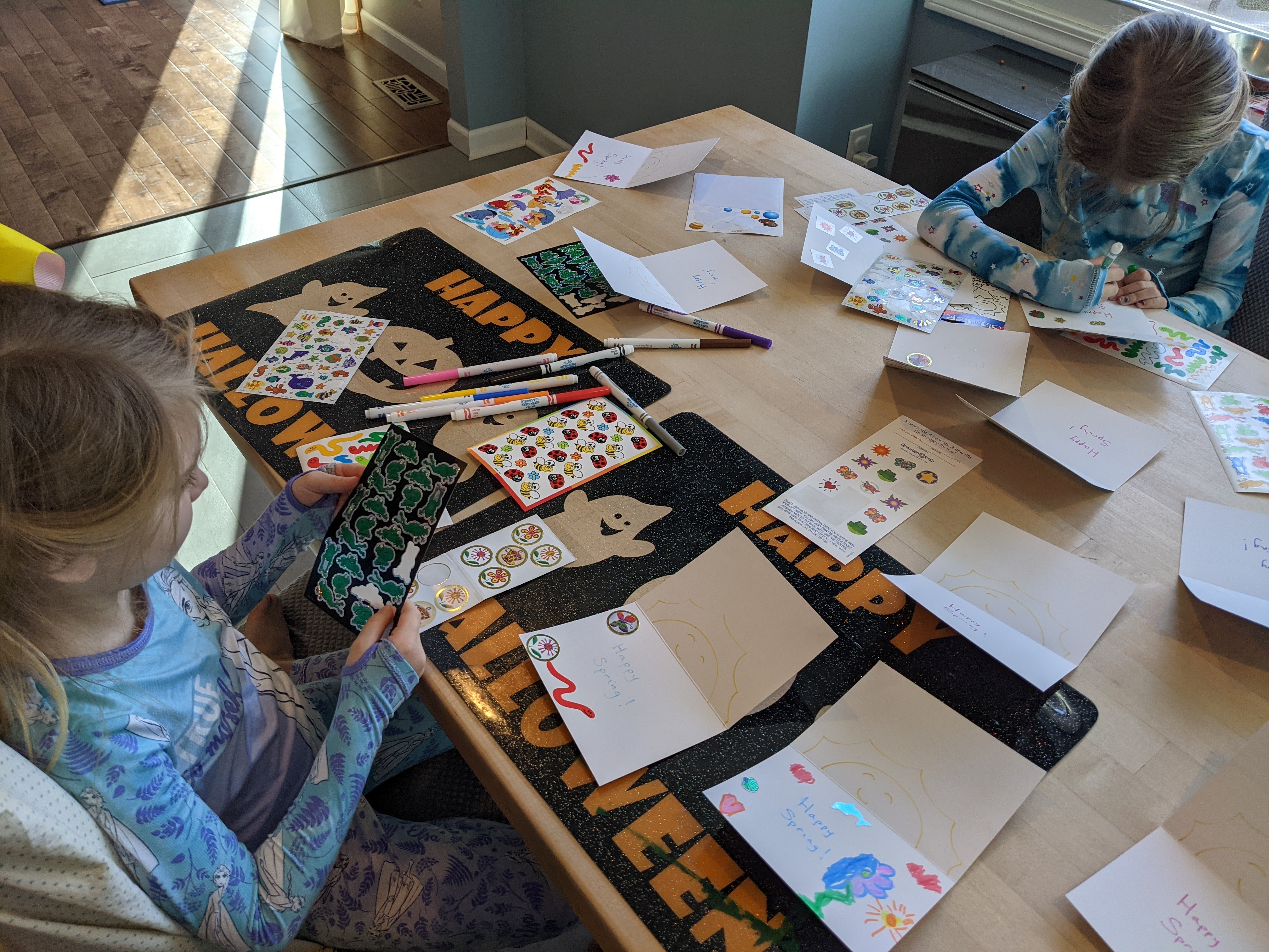 March 19, 2021: Tomorrow is the first day of Spring and I like to spread joy. So we spent time making Happy Spring cards and delivering them to people we know and kinda know in the neighborhood. Lots of people say they like our sidewalk drawings, quotes, and jokes so hopefully they enjoy our home delivery too. Happy Spring!!