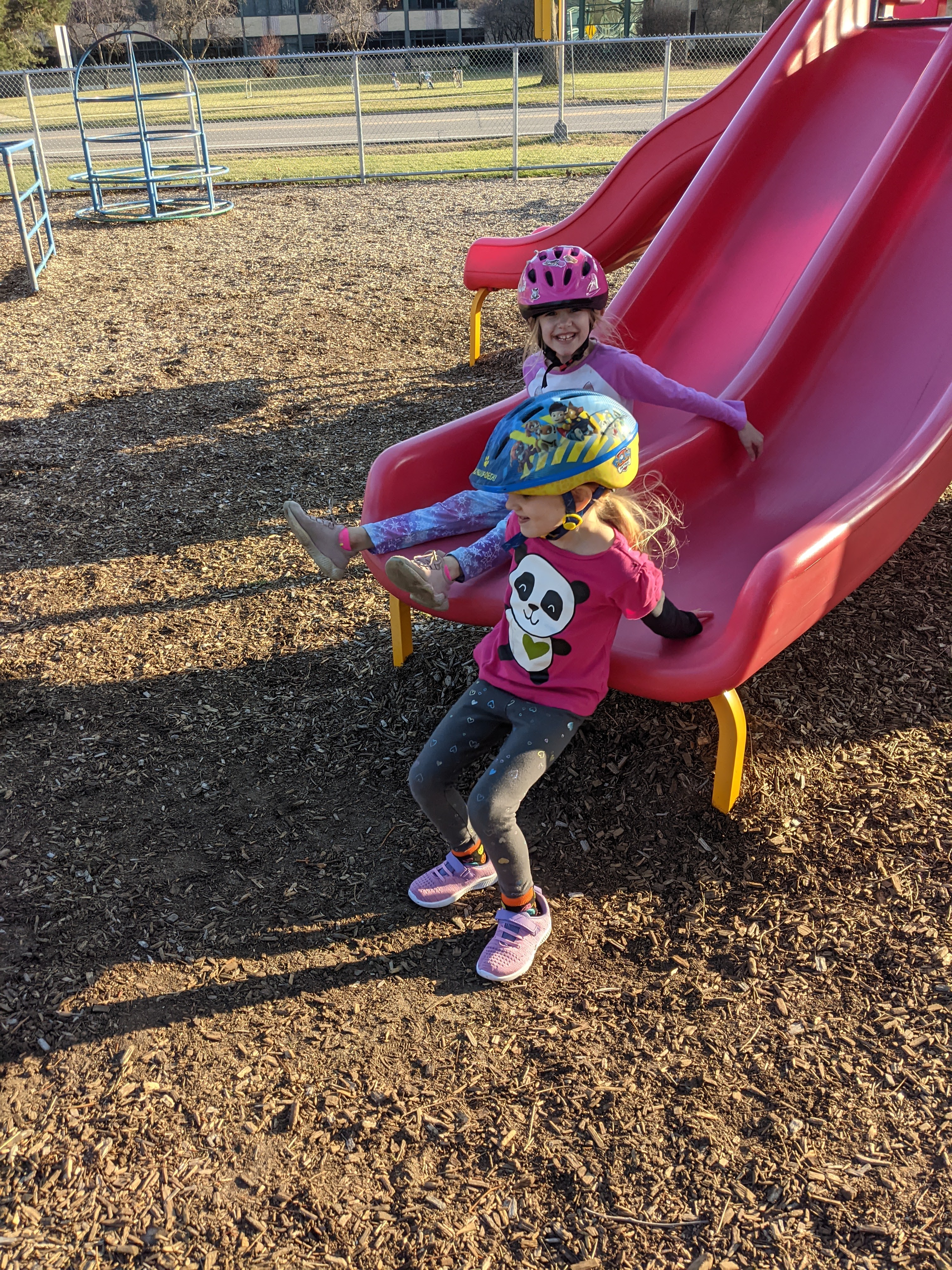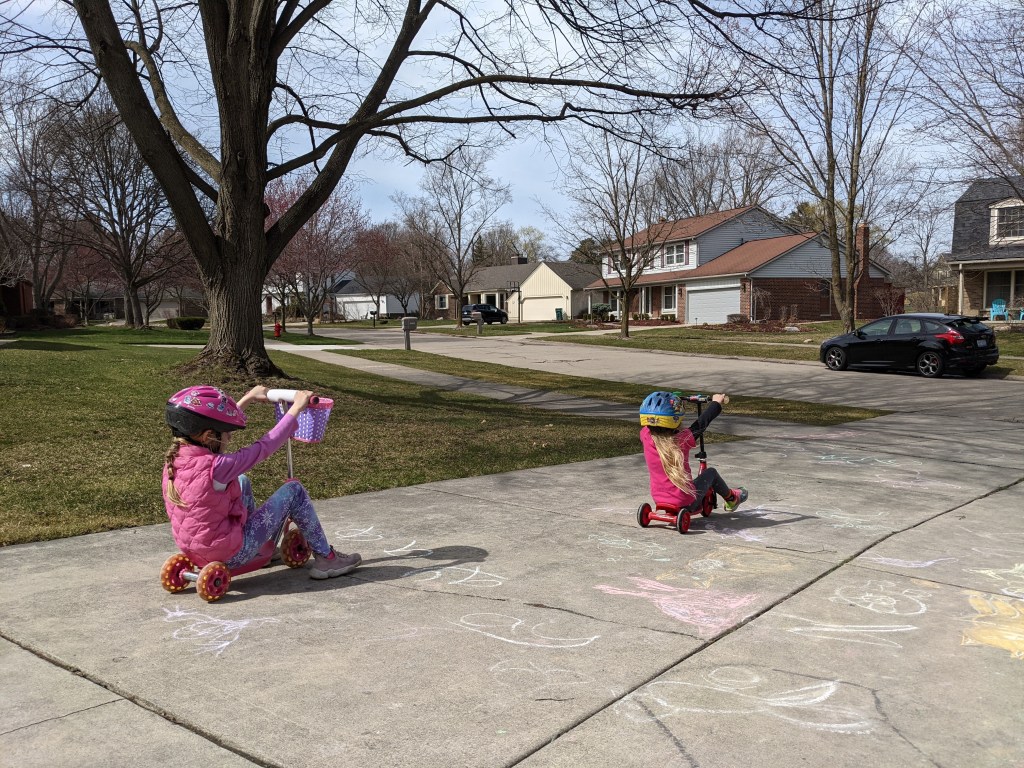 March 30, 2021: We like to race each other but not really race each other. We’re just too competitive and then one of us gets upset. Racing down the driveway on our scooters or the slides at the playground is only to see who is faster….and if it were a real race, we’d be the fastest team around!