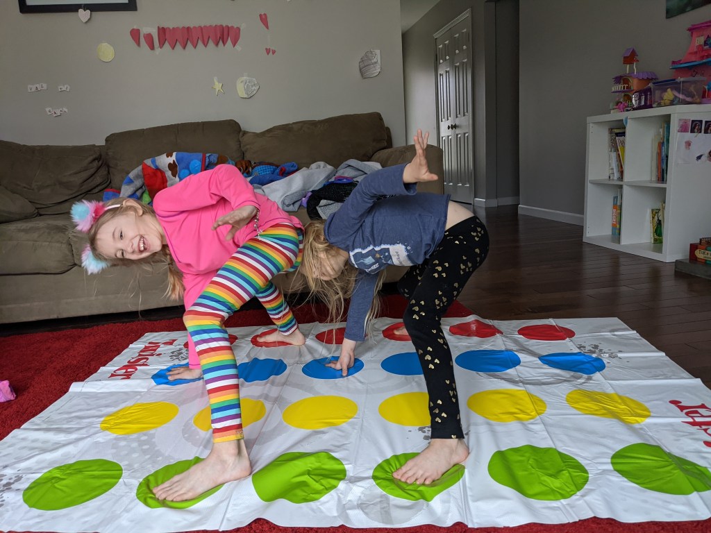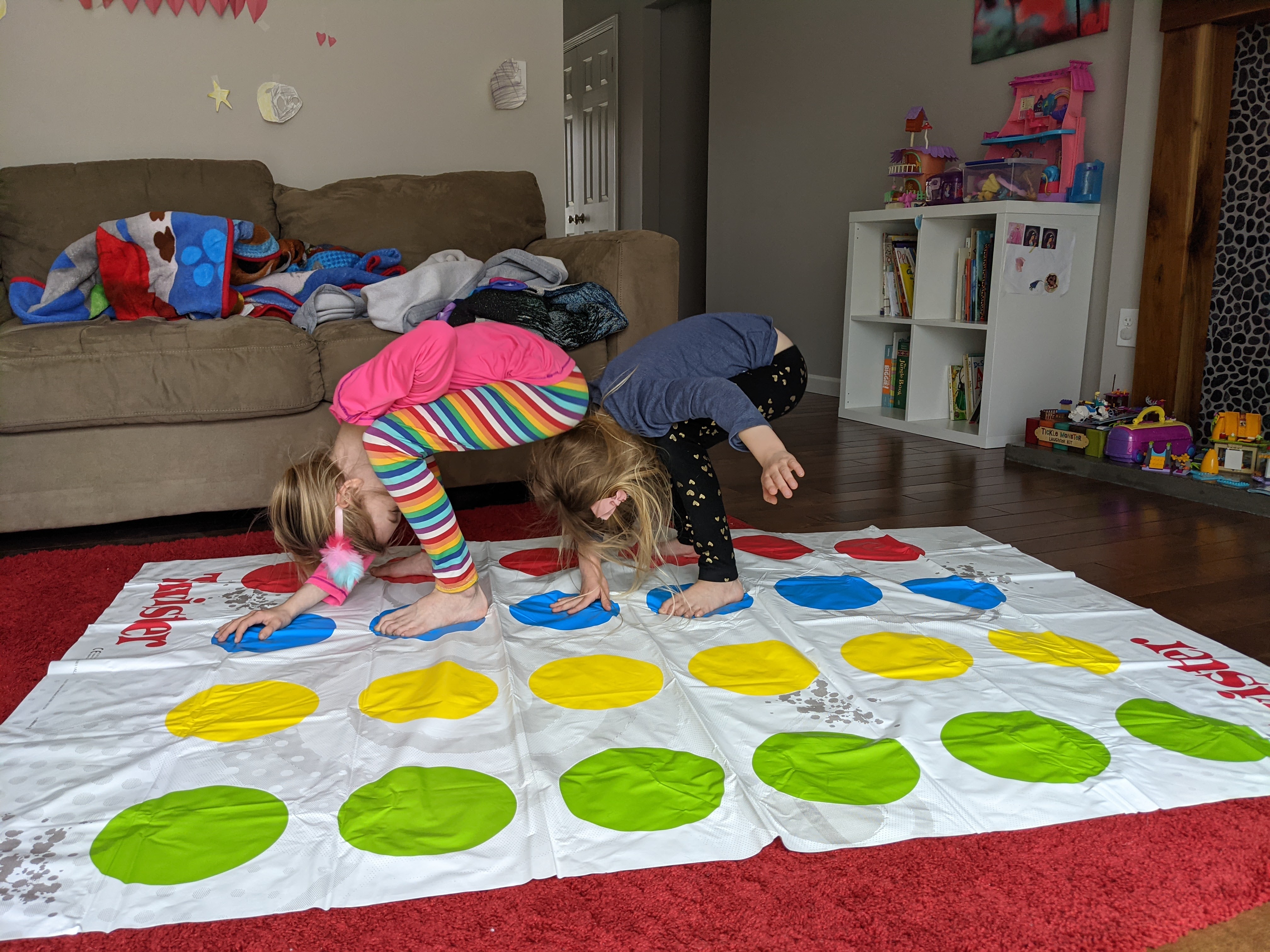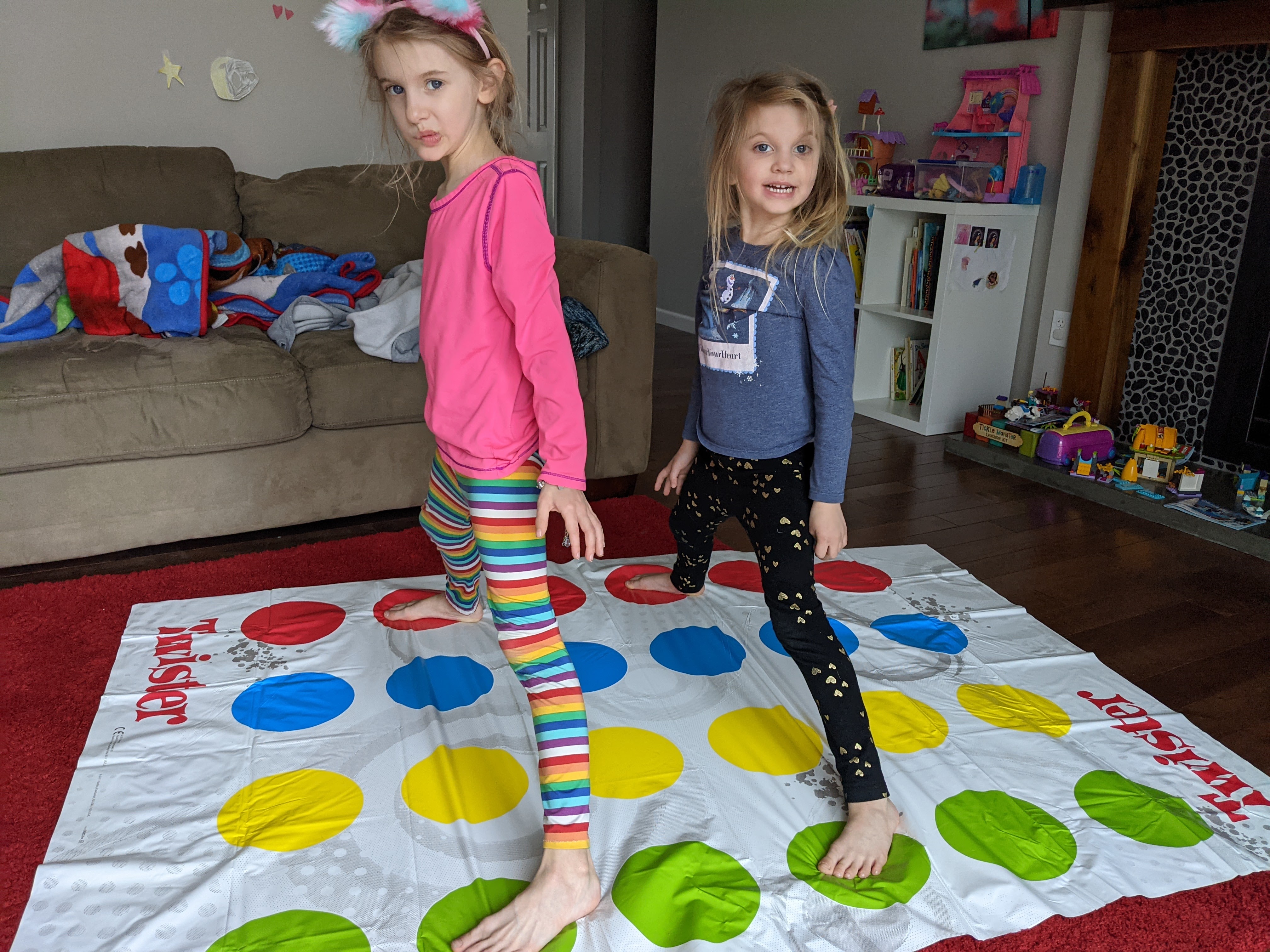 April 1, 2021: We got the game Twister a while ago. We played it once and forgot about it. Fin brought it out this morning and we played it. It was ridiculous! But it was so fun! We couldn’t stop giggling and neither could mommy!
