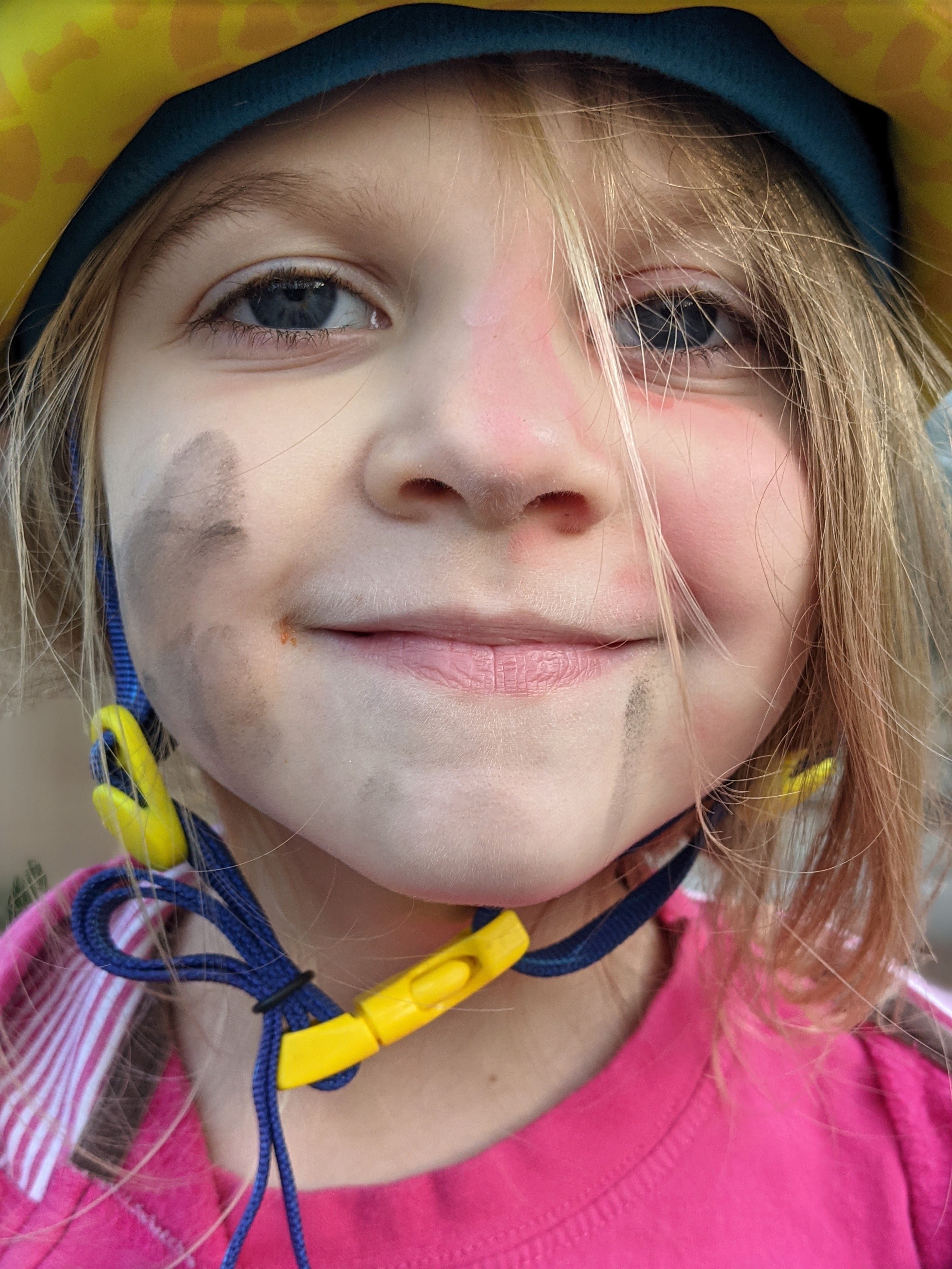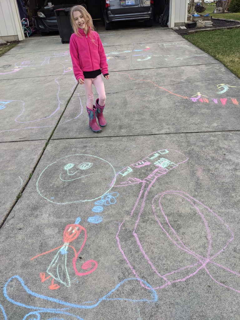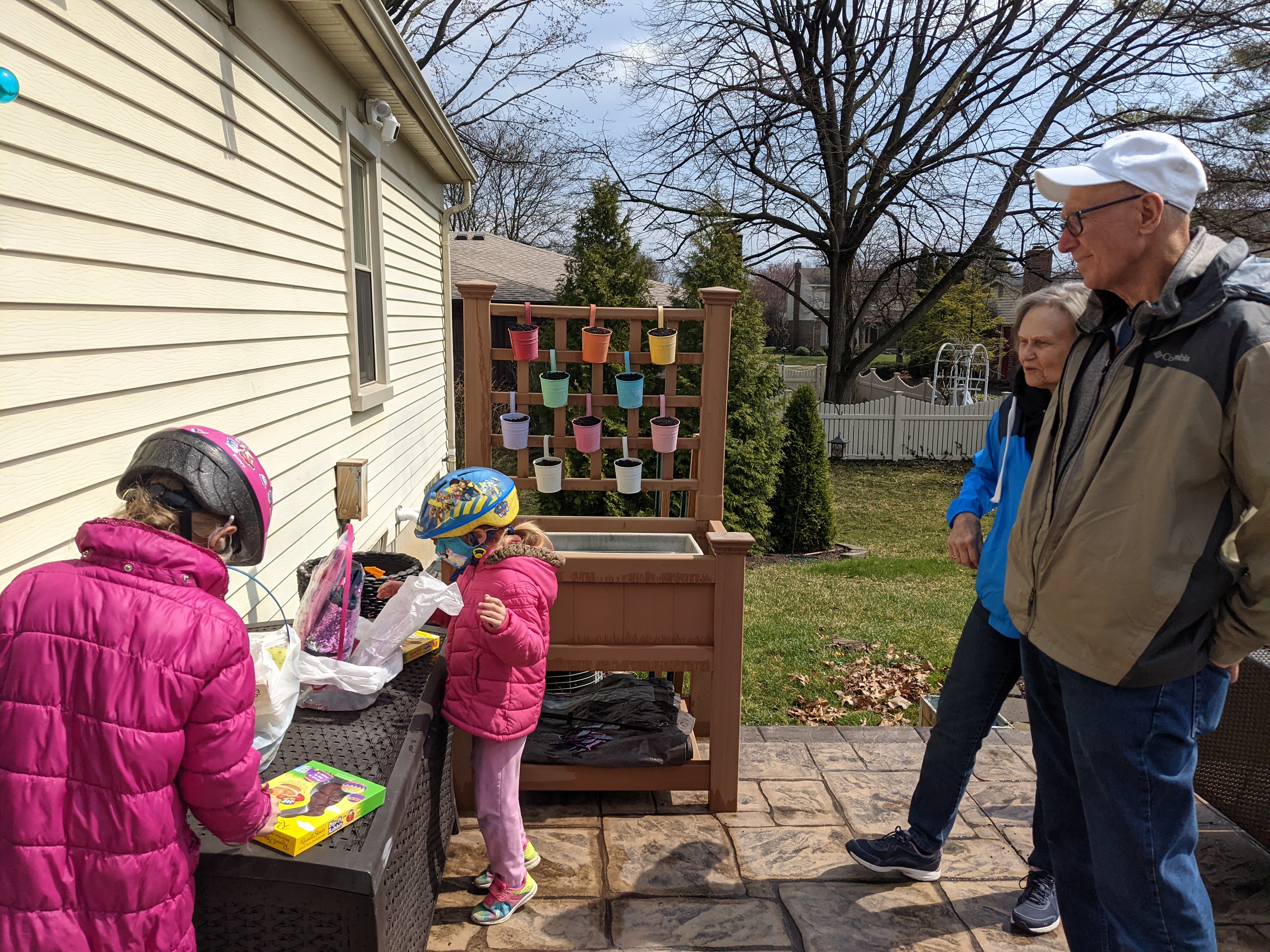 April 5, 2021: Grammie and papa finally got home from Florida today. I don’t think they recognized me because I’m a big kid and I can ride my big kid two wheel bike all by myself. Or it could have been the mask over my face or the chalk under the mask over my face.
