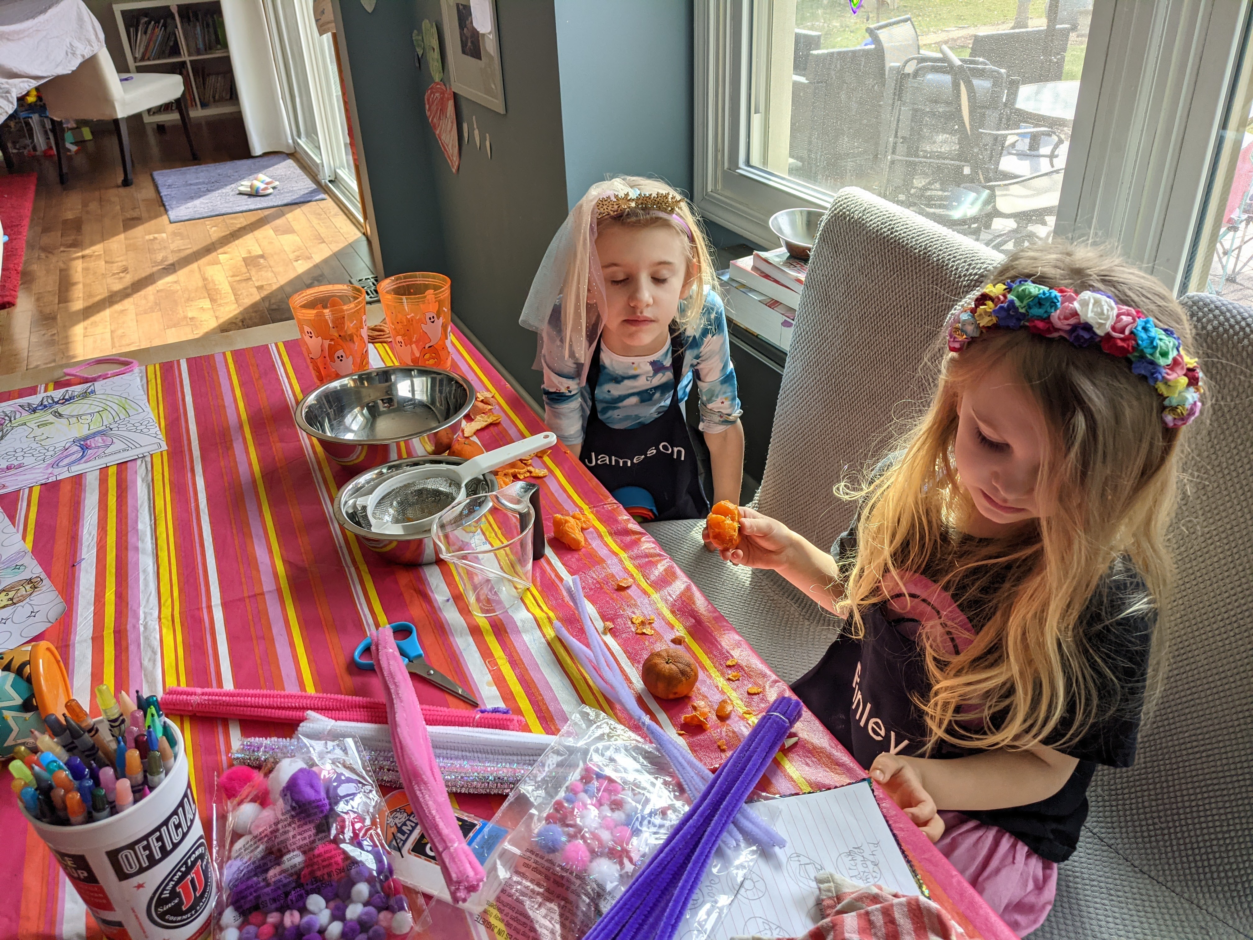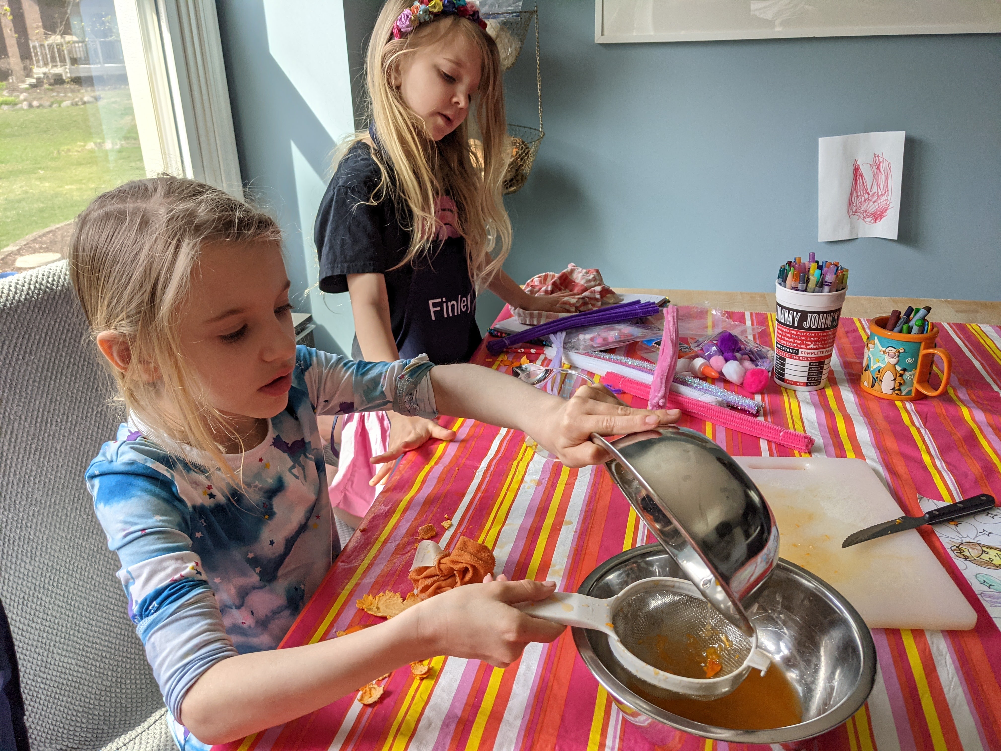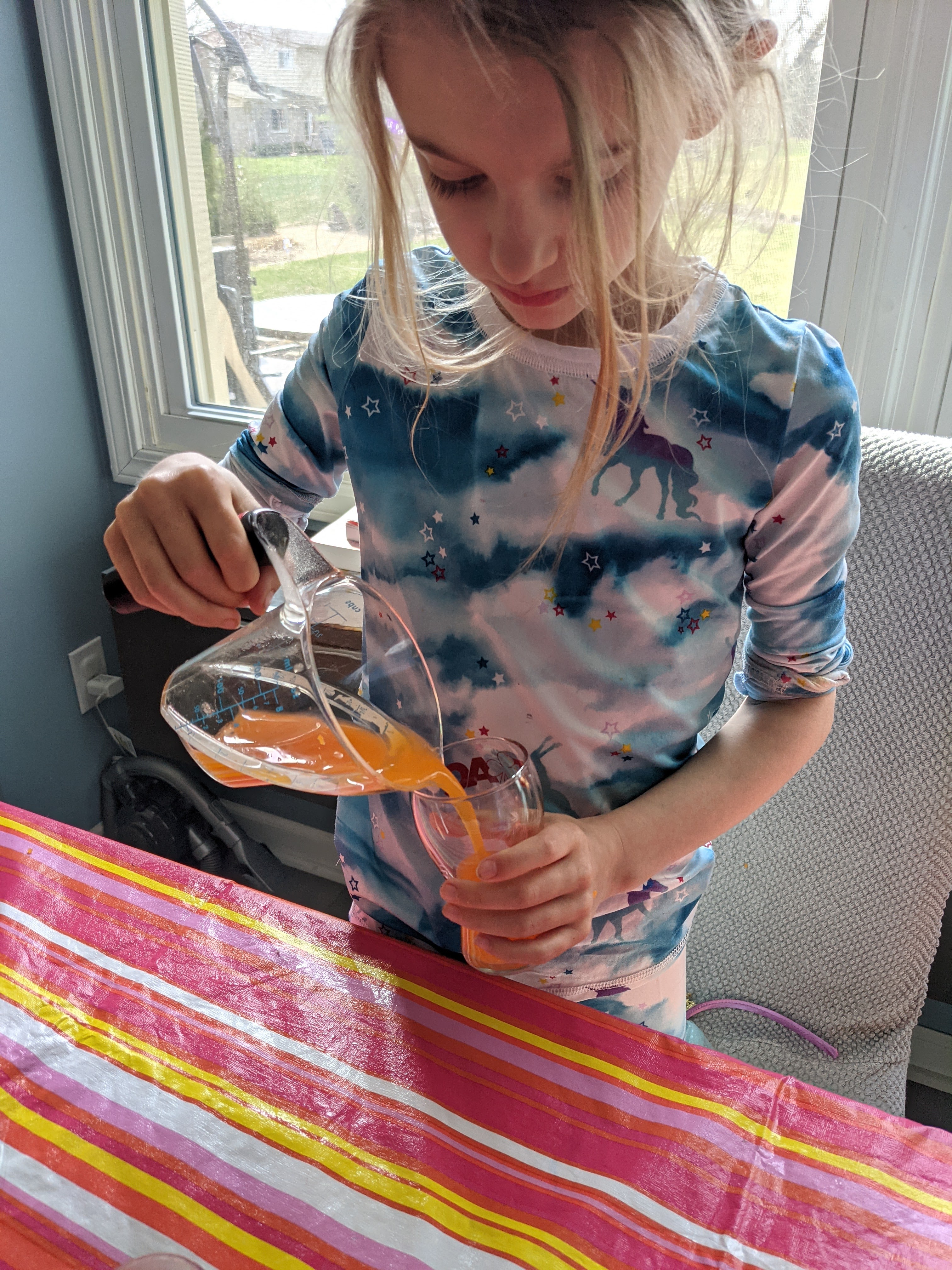 April 7, 2021: Mommy and daddy were busy working this morning but we had plans to serve freshly squeezed orange juice at a party for Harley, so we did it ourselves! We put our hair back, grabbed our aprons, washed our hands, got the oranges, the strainer, and a few bowls. We peeled a few oranges but the juice hurt the cut on my hand. I asked mommy for help and she was soooooo surprised! She had no idea what we were doing! We let her help because she suggested cutting the oranges instead of peeling them. That was a good tip. We are ready to set up our very own lemonade stand when sick week is over!
