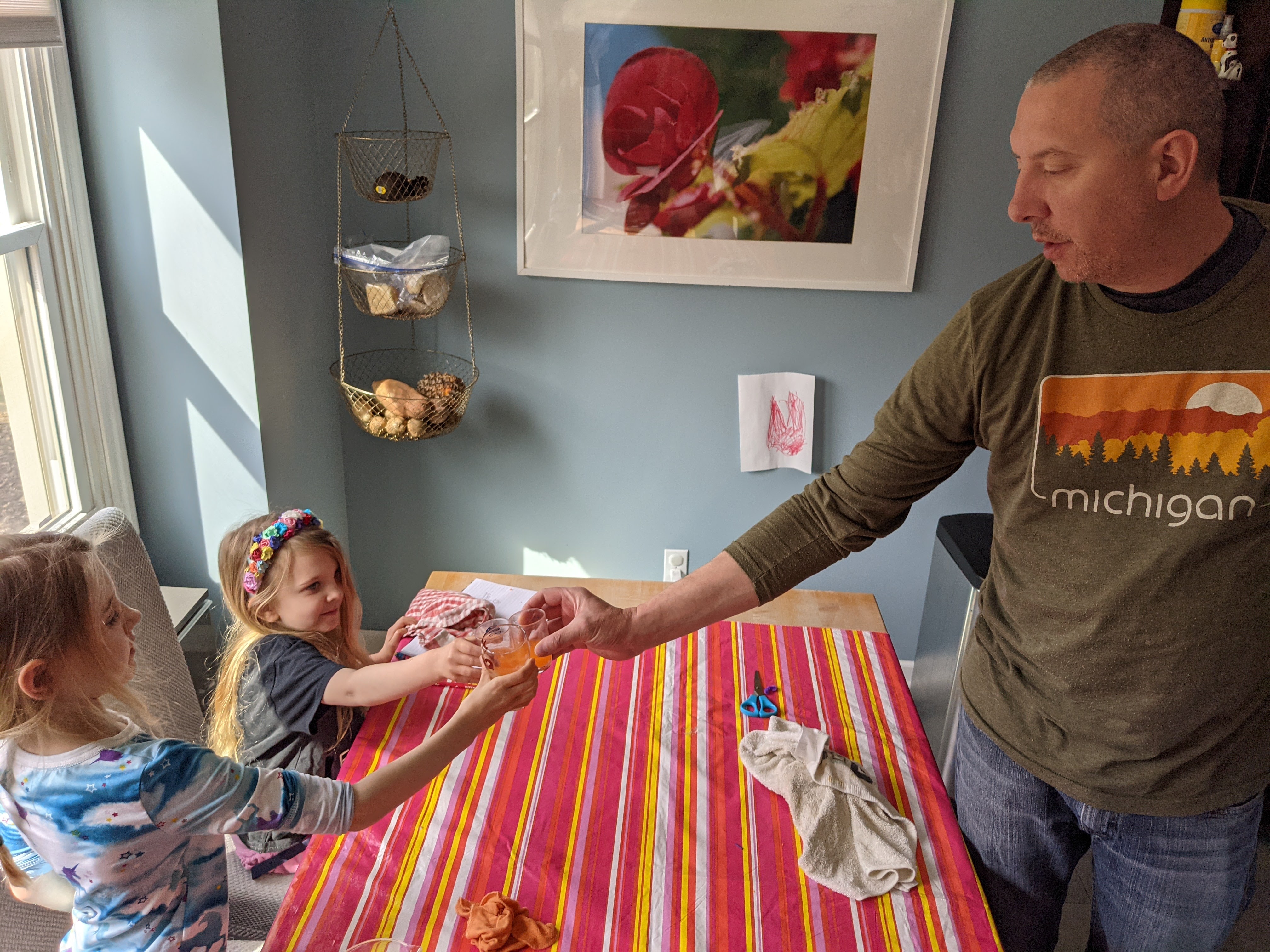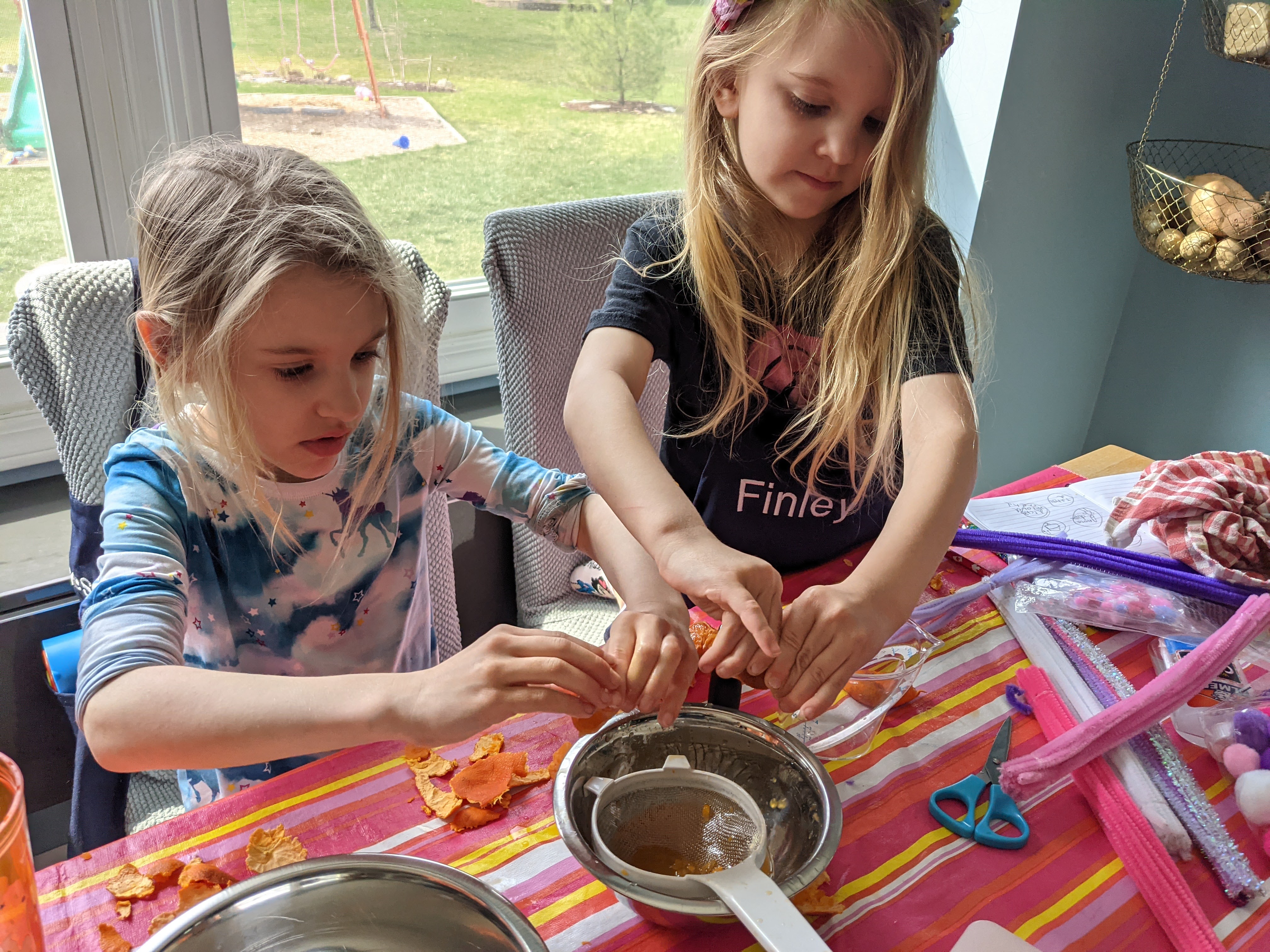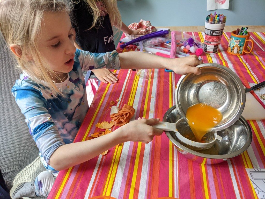 April 7, 2021: Mommy and daddy were busy working this morning but we had plans to serve freshly squeezed orange juice at a party for Harley, so we did it ourselves! We put our hair back, grabbed our aprons, washed our hands, got the oranges, the strainer, and a few bowls. We peeled a few oranges but the juice hurt the cut on my hand. I asked mommy for help and she was soooooo surprised! She had no idea what we were doing! We let her help because she suggested cutting the oranges instead of peeling them. That was a good tip. We are ready to set up our very own lemonade stand when sick week is over!