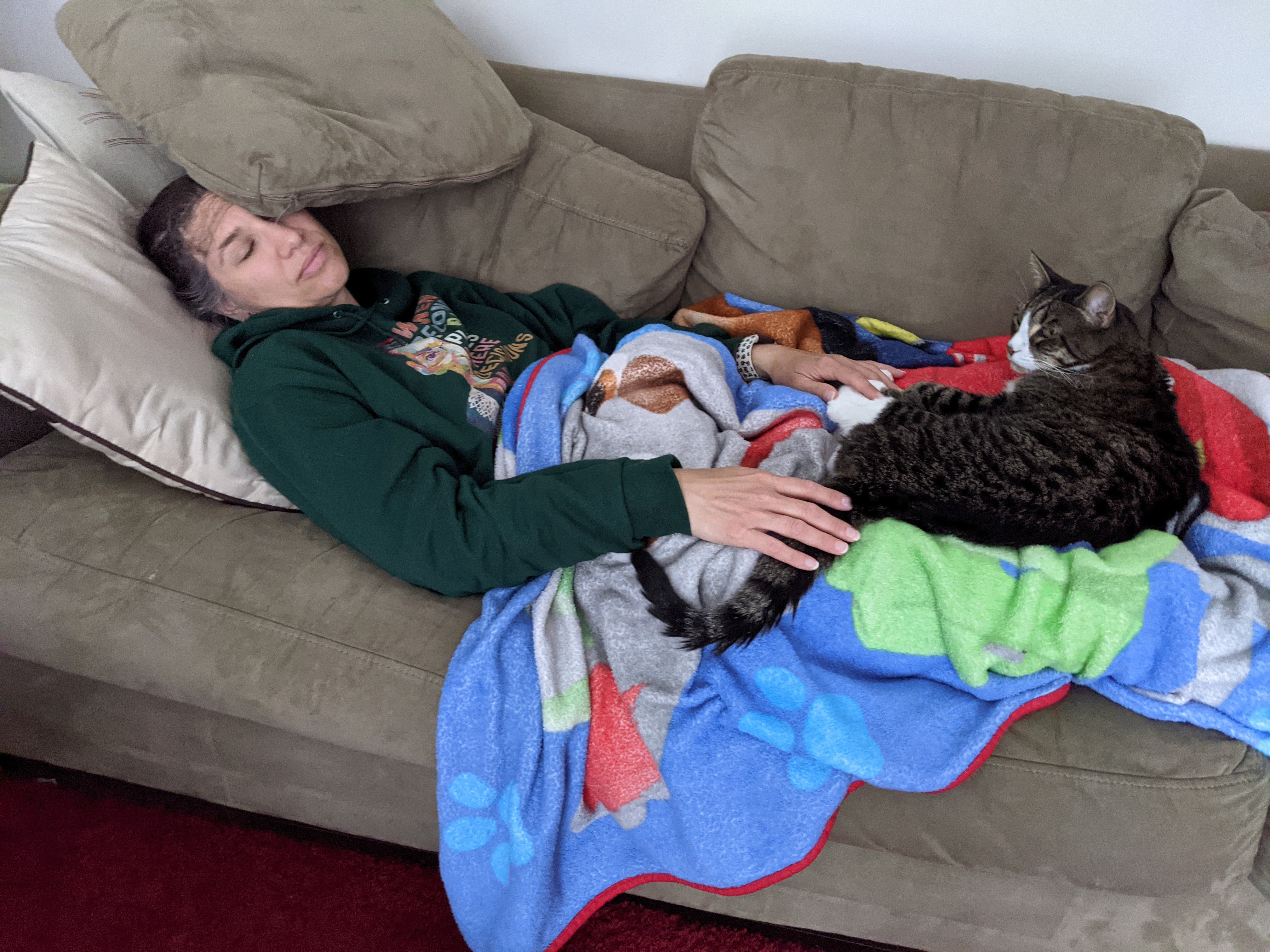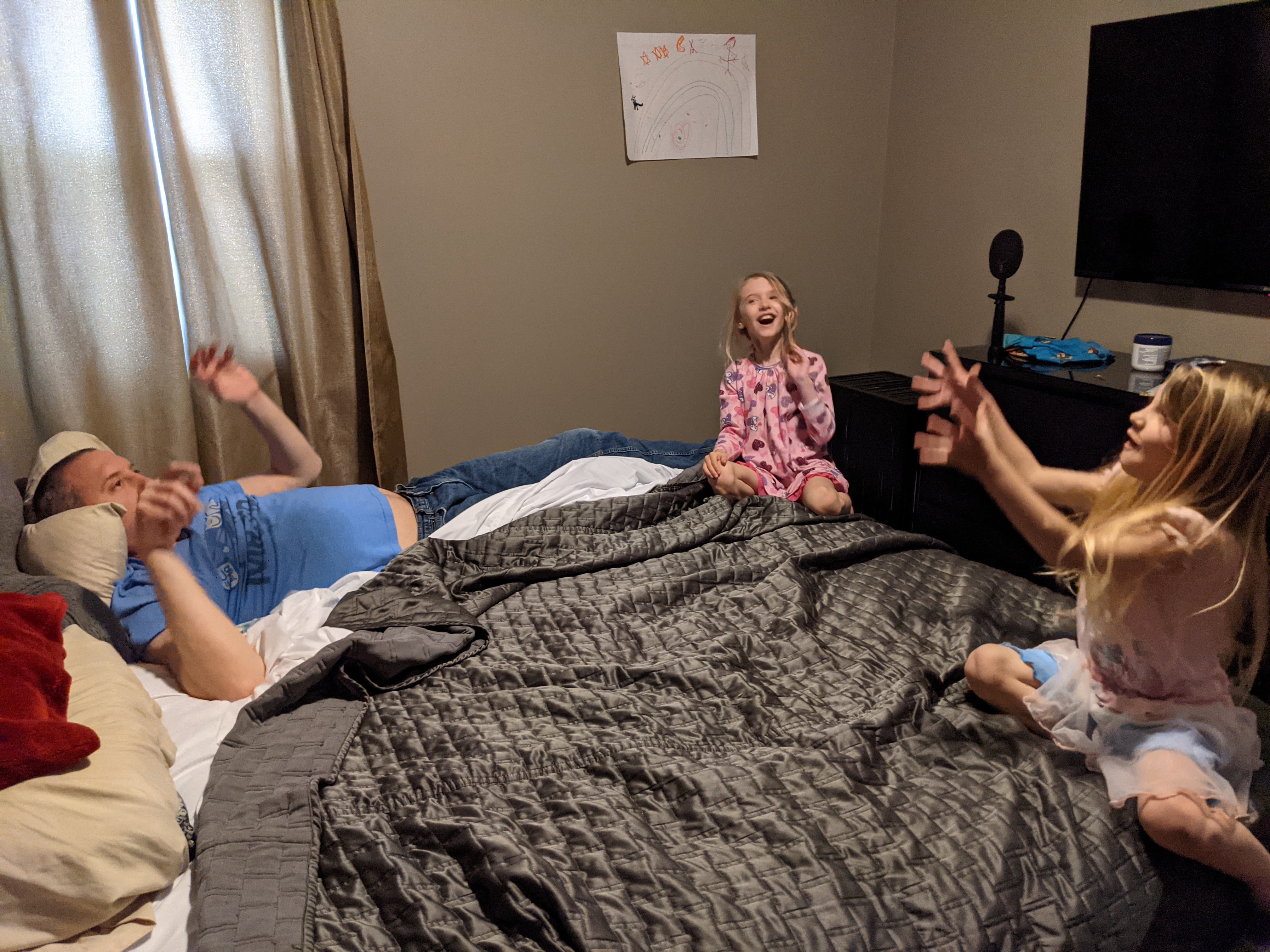 April 18, 2021: These vaccine shots are weird. Seems like they made mommy feel worse and daddy’s back feel a little bit better. Mommy is kinda down for the count, so we got our own snacks and played quietly so she could sleep. Then we put Harley in charge of her. Daddy felt good enough to play games with us in his bed, so we could be loud with him. Hopefully everyone feels better tomorrow cause the we see dishes, but we can’t see the sink anymore.