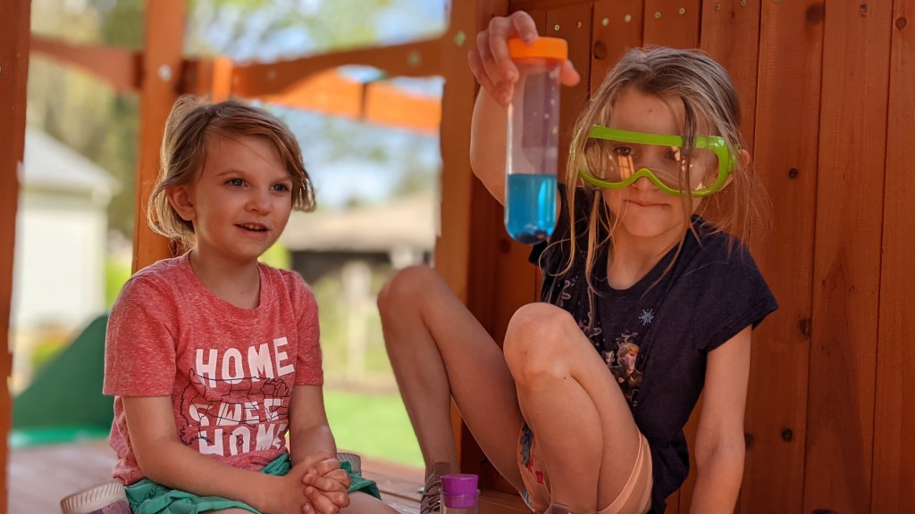 May 2, 2021: Mommy is so sneaky. She makes school so much fun that all our weekend games have started being schooly. Today was Sunday, but we found ourselves doing a science experiment in the clubhouse. Mommy wasn’t even involved. She didn’t even suggest we do it. We just did! Anyway, we confirmed our hypothesis: Rainbow water can be made from primary colored jelly beans. We need some normal kids to play with soon!