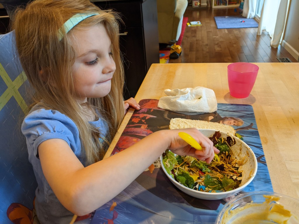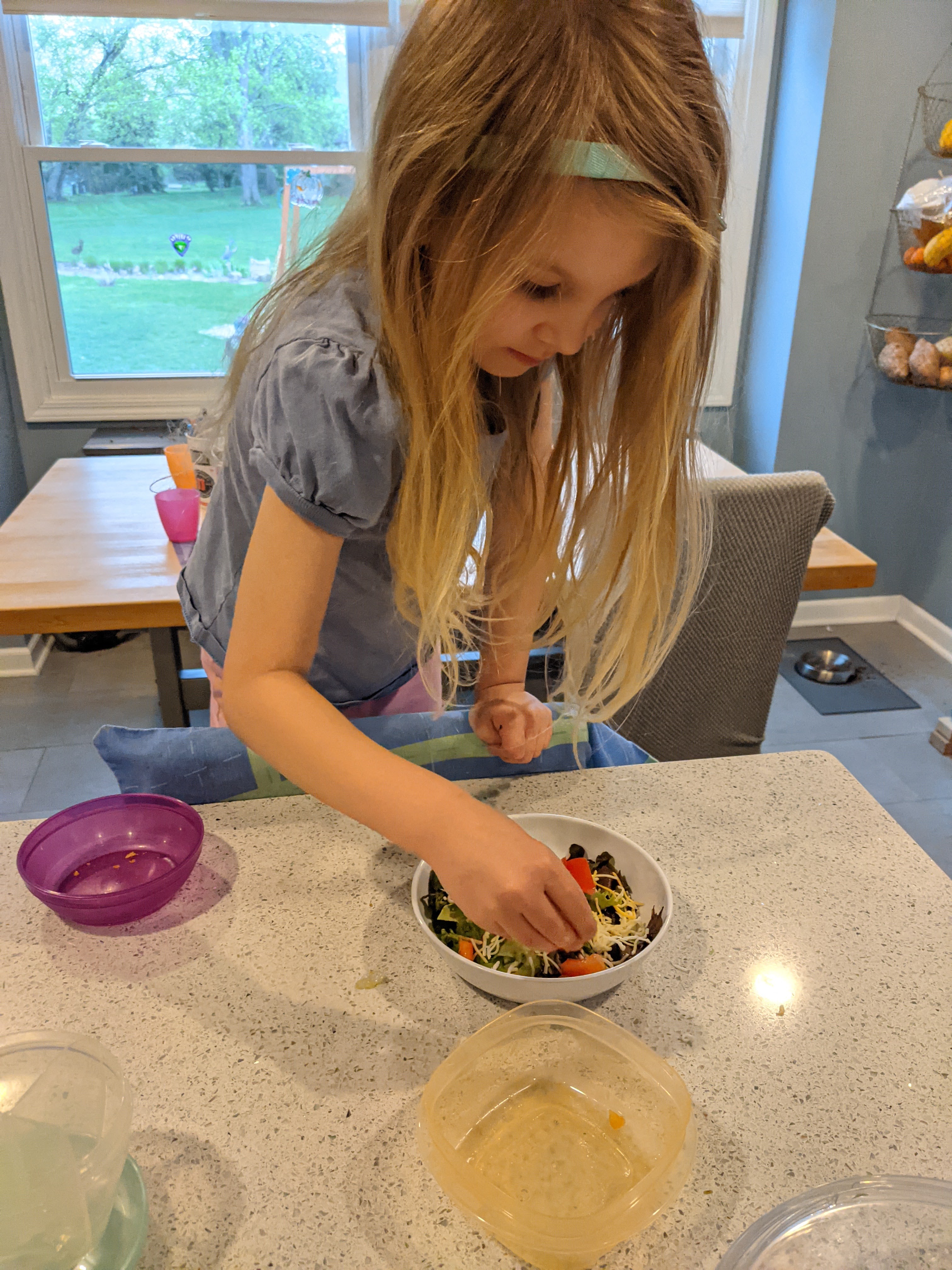 May 6, 2021: The other day we made mommy a salad. It looked soooooo good. Most of the time when daddy asks me what I want for lunch or dinner, I’m busy playing so I just tell him something to get back to playing. I really don’t think much before I tell him. Today I decided I wanted a big kid salad. Just like mommy. And I wanted to build it myself. It was really yummy. Now I need to teach daddy how to make my famous salad.