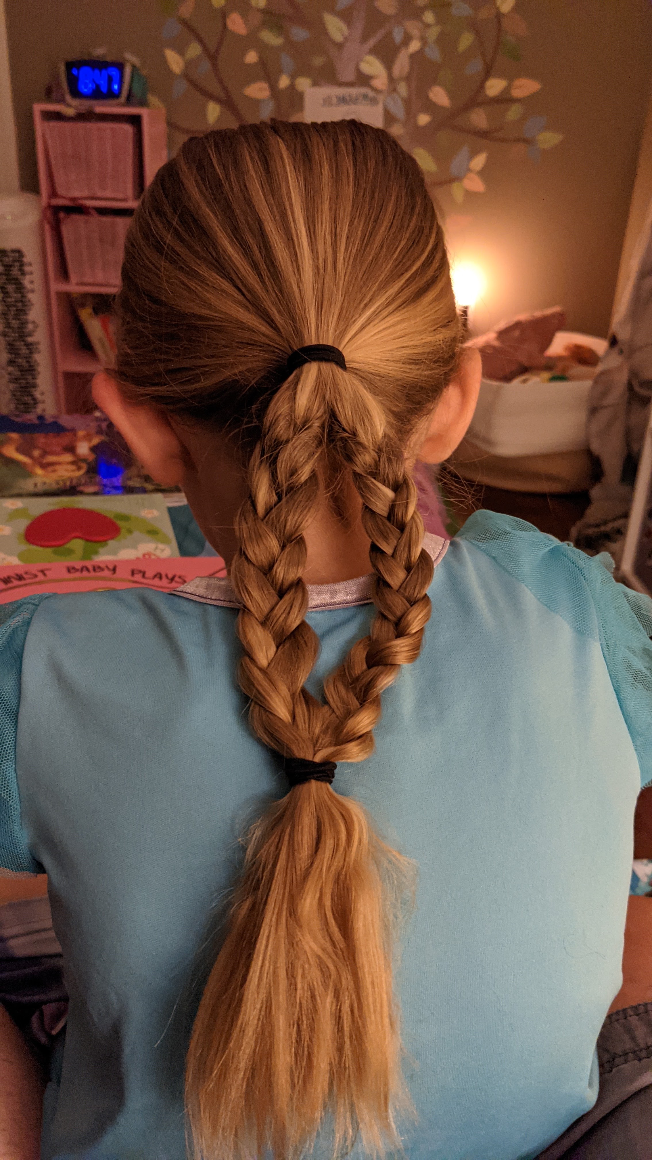 May 15, 2021: Typing class started today and I asked for extra homework. I can’t wait to get past all this j j j j f f f f stuff and get to the clickety clackity click clackity clack that mommy and daddy do. Also, I think daddy has accepted mommy’s hair braiding challenge. Tonight he made two braids turn back into one. Does mommy let this go or does she respond?
