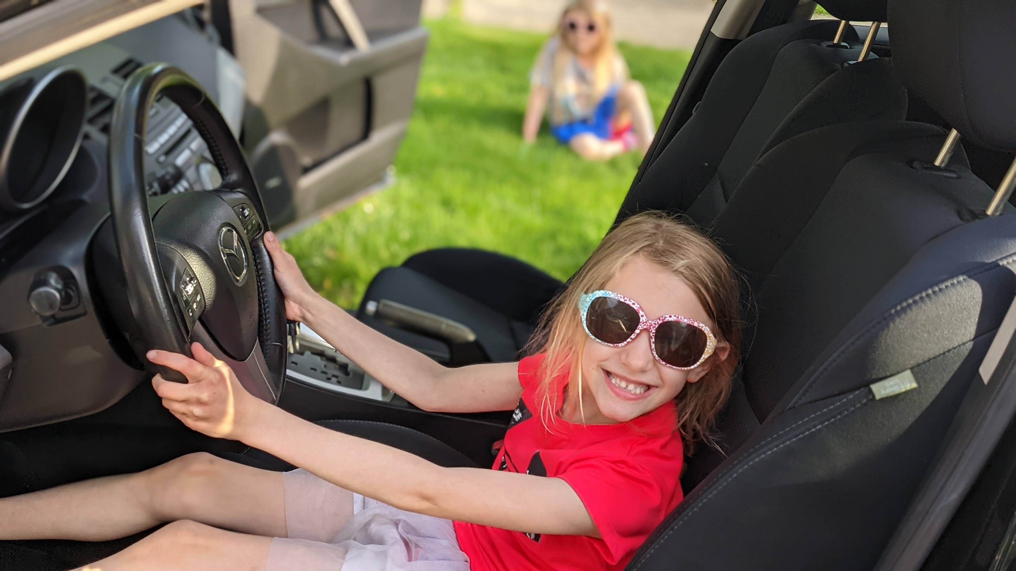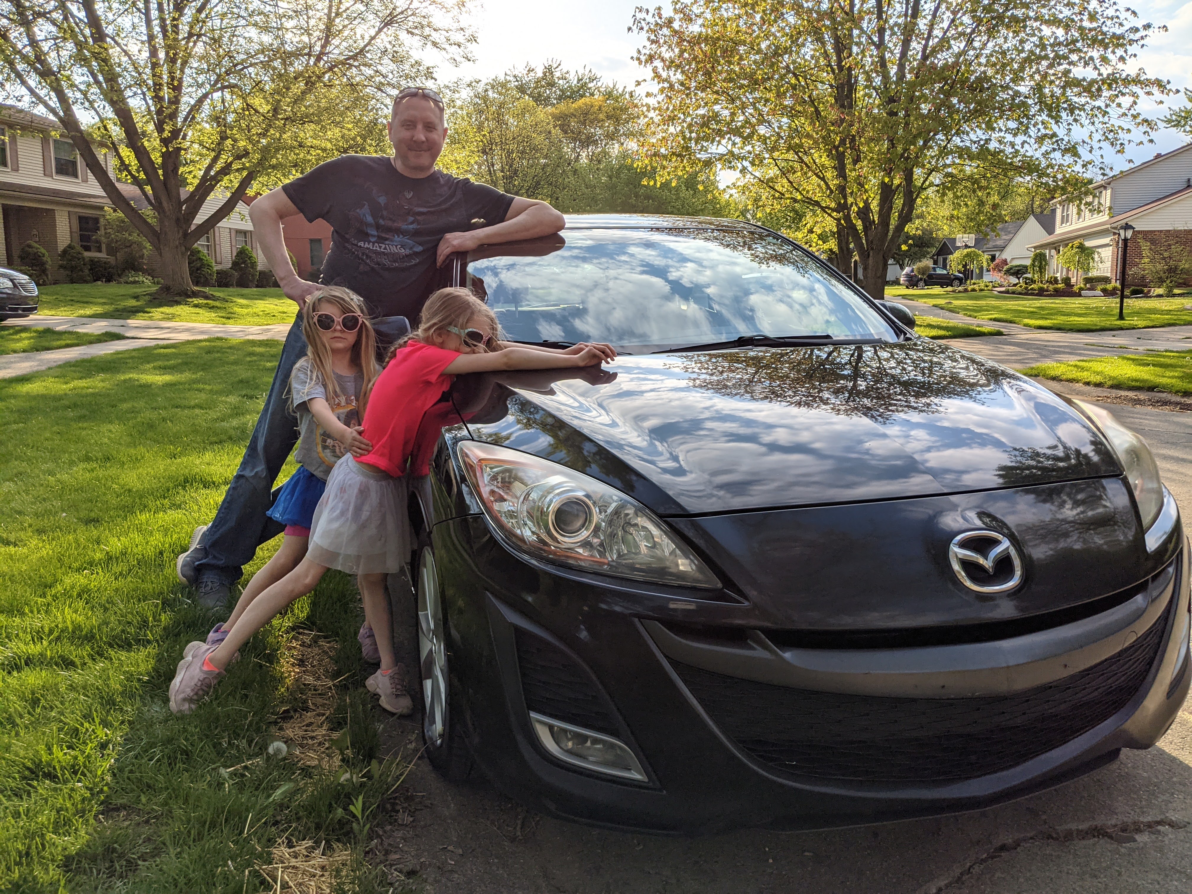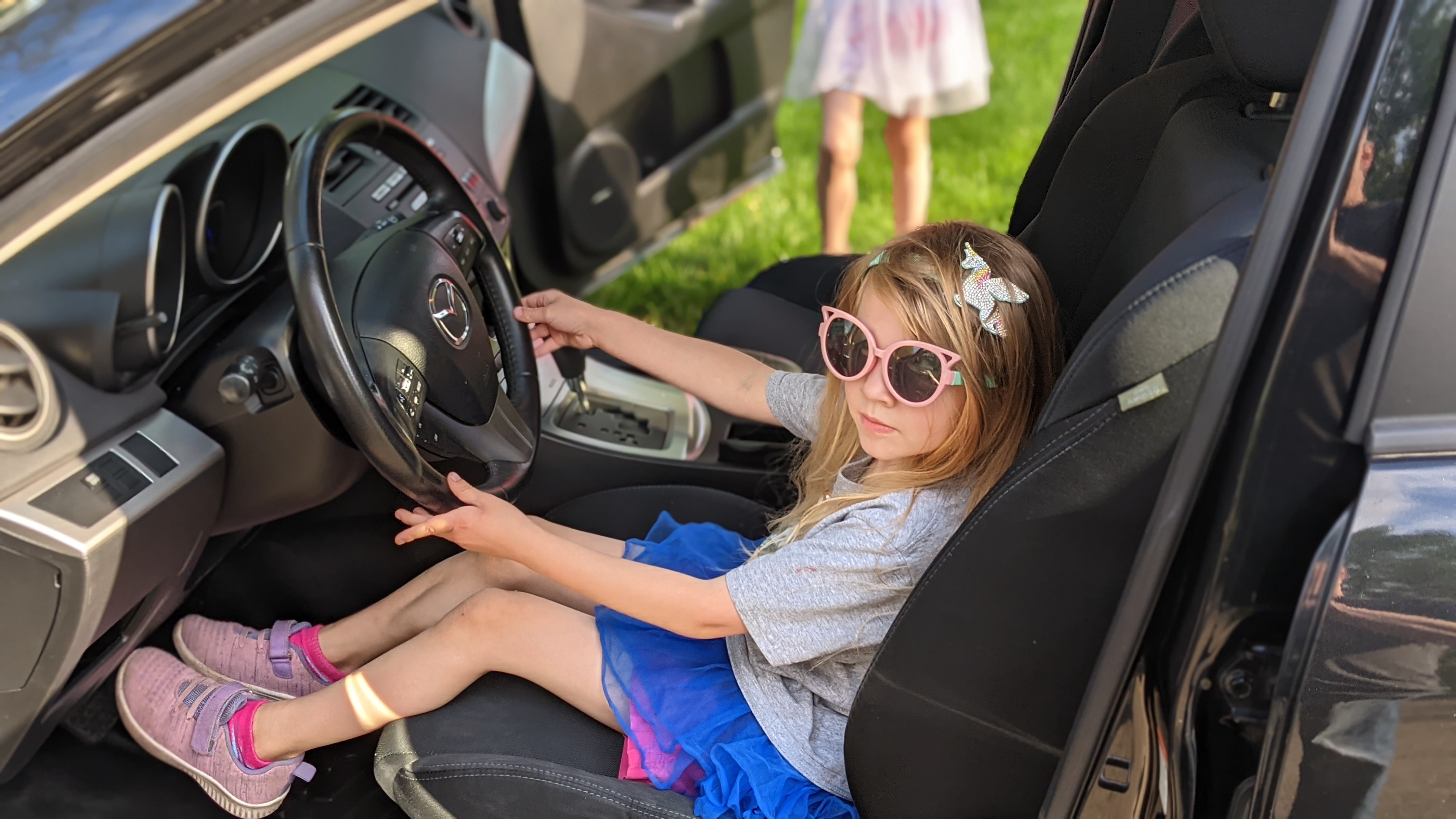 May 16, 2021: We are a little upset today. Daddy posted his car for sale this morning and someone bought it this afternoon. I wanted to keep it forever. I thought maybe I could drive it when I’m a bigger kid. Jameson isn’t very happy either. It made us feel a little better that he let us pretend to drive it and take pictures with it before it goes away. He also said that we can have the new car he is going to buy. It better be good and it better be rainbow, daddy. Meanwhile, Mommy braided Jameson’s hair into two separate braids. This battle is getting serious.