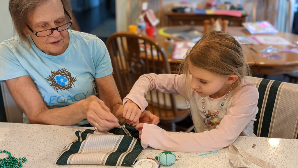 May 28, 2021: It was rainy today. We sent mommy and daddy on a date to Menards while grammie taught me to sew. I made a purse! Well, grammie and I made it together, but I did a bunch of the work. I wonder if I could use all my new skills to weave a latch hooked, sewn, potholder or something?
