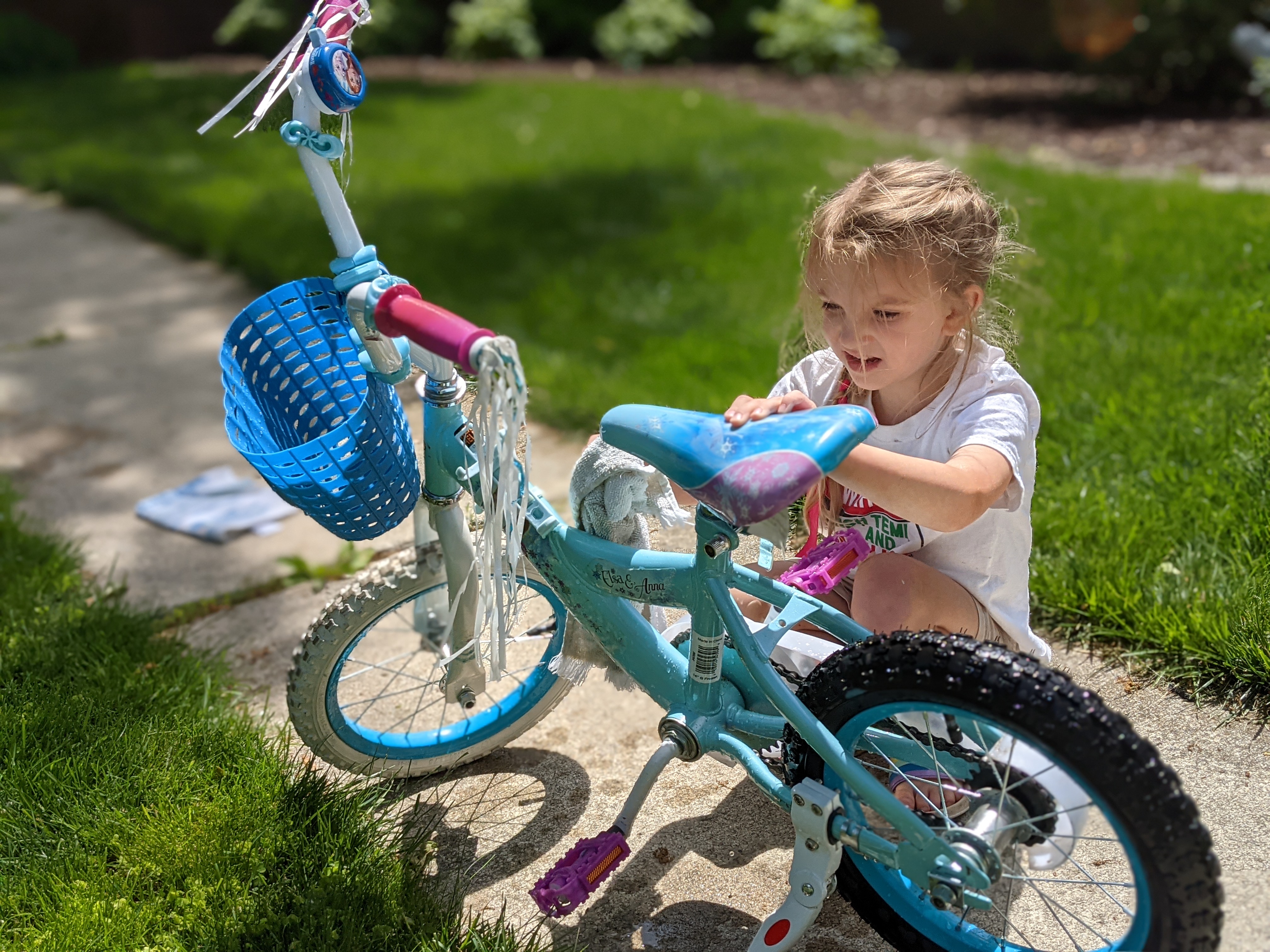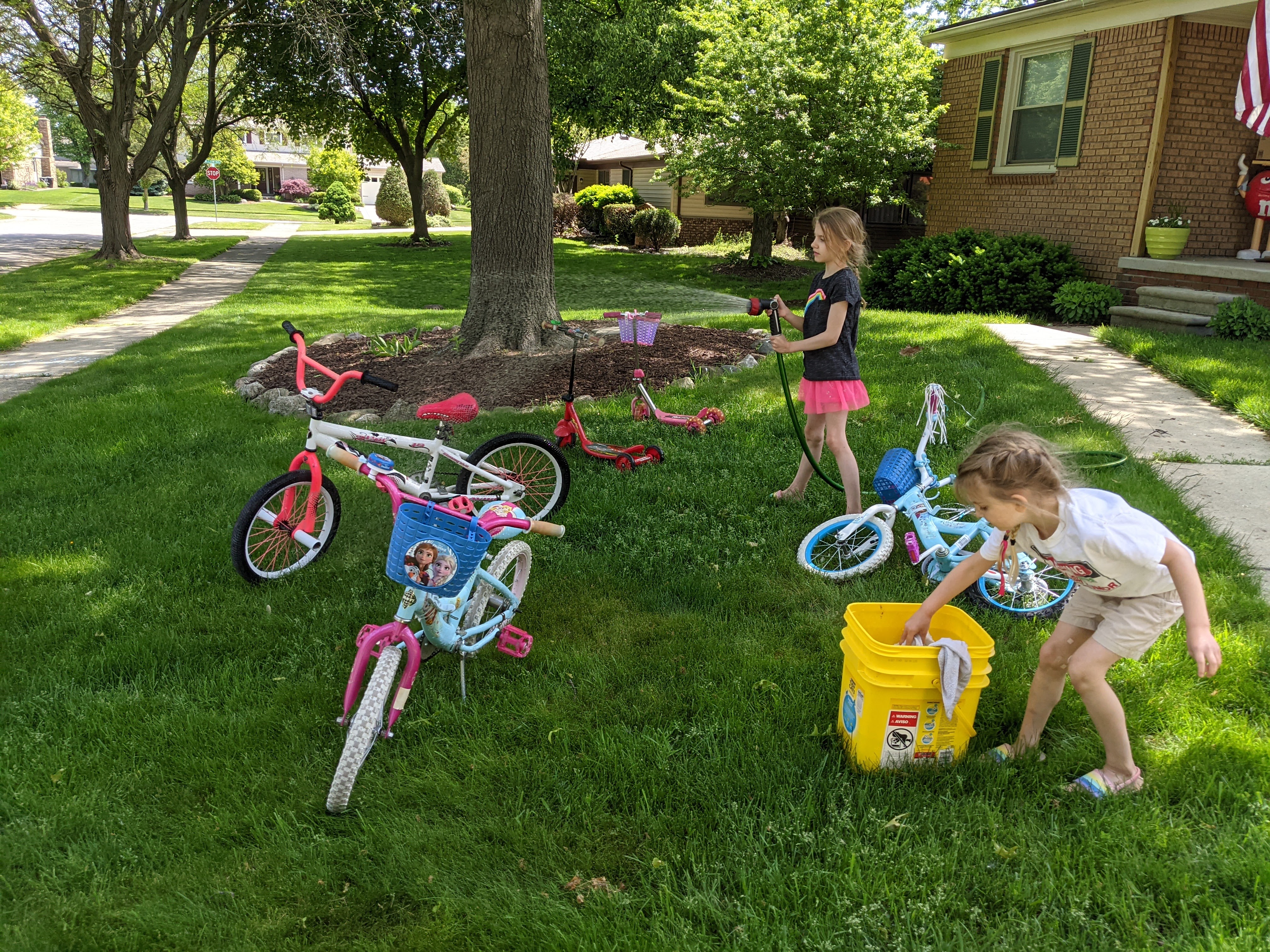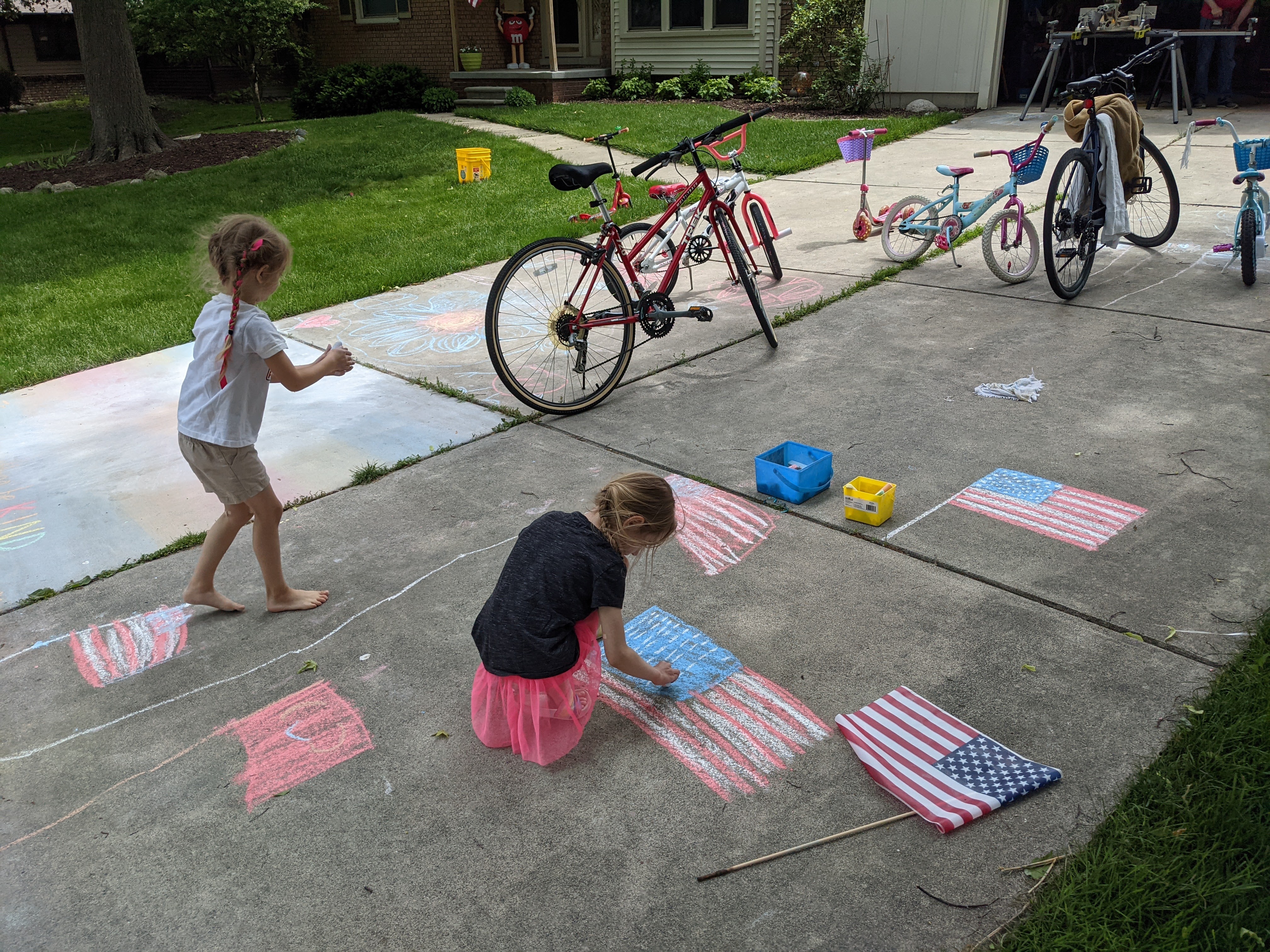 May 31, 2021: On holidays we don’t have school and mommy and daddy don’t work. But on this holiday we all worked outside all day long. Mommy and daddy worked on the path, and Jameson and I worked on washing our bikes and decorating the driveway. We have a lot more bikes because Jameson got her old new bike back from papa’s house and I started riding Jameson’s bike. Plus we have my old bikes AND our scooters! So much for relaxing on the day off!