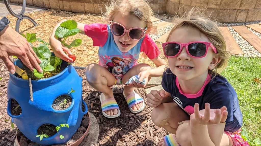 June 5, 2021: Our neighbor Chelsea comes over once a week to do yoga with us. It’s pretty exciting to have a teacher other than mommy for something. After class we checked on our strawberry plant and we had one red strawberry! We split it four ways and it was delicious! Hmmm. Strawberry + yoga = strawberry Yogi? Maybe this is how our strawberry Yogi snacks are made?!