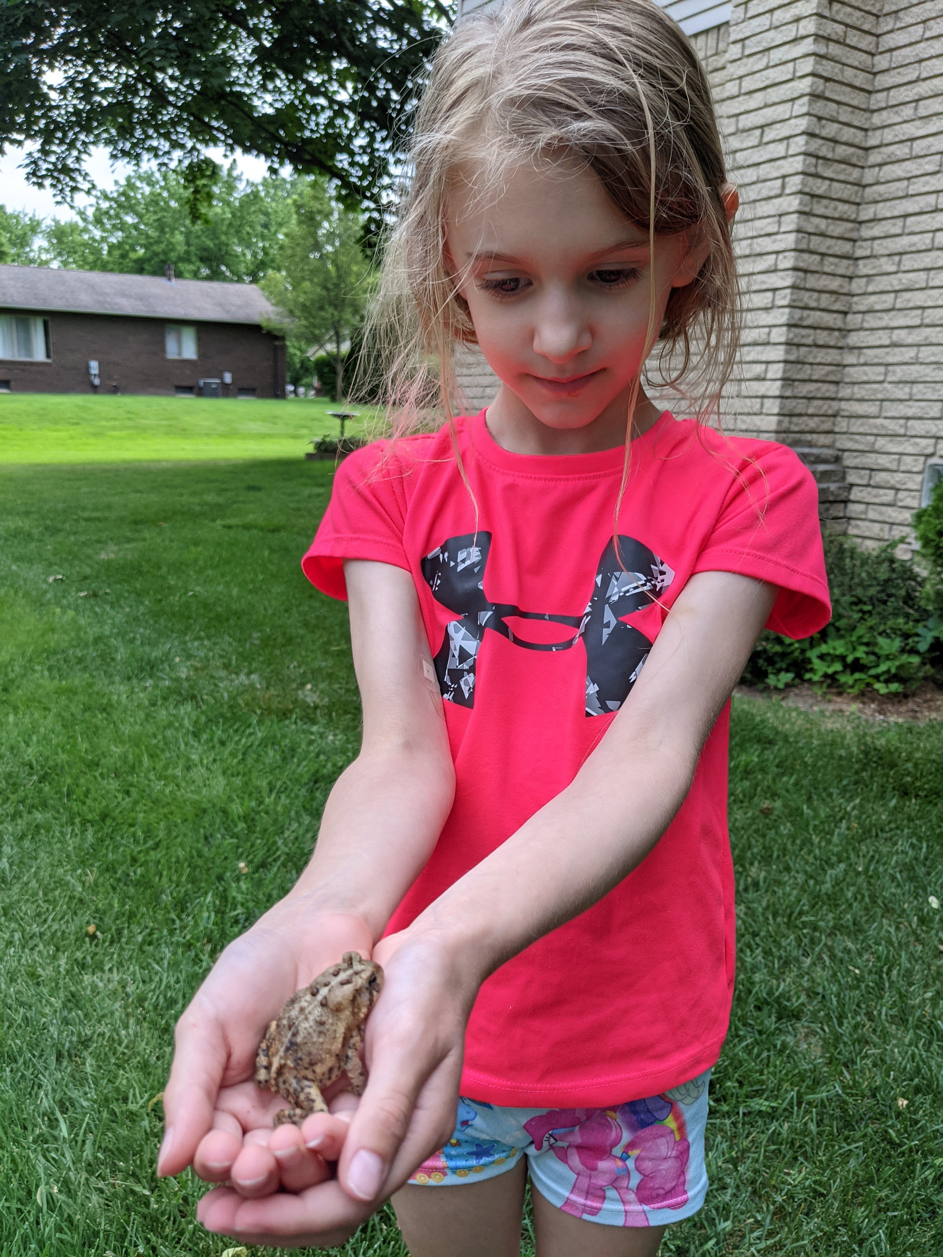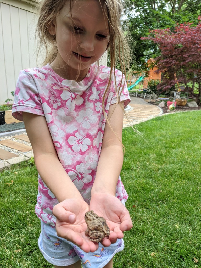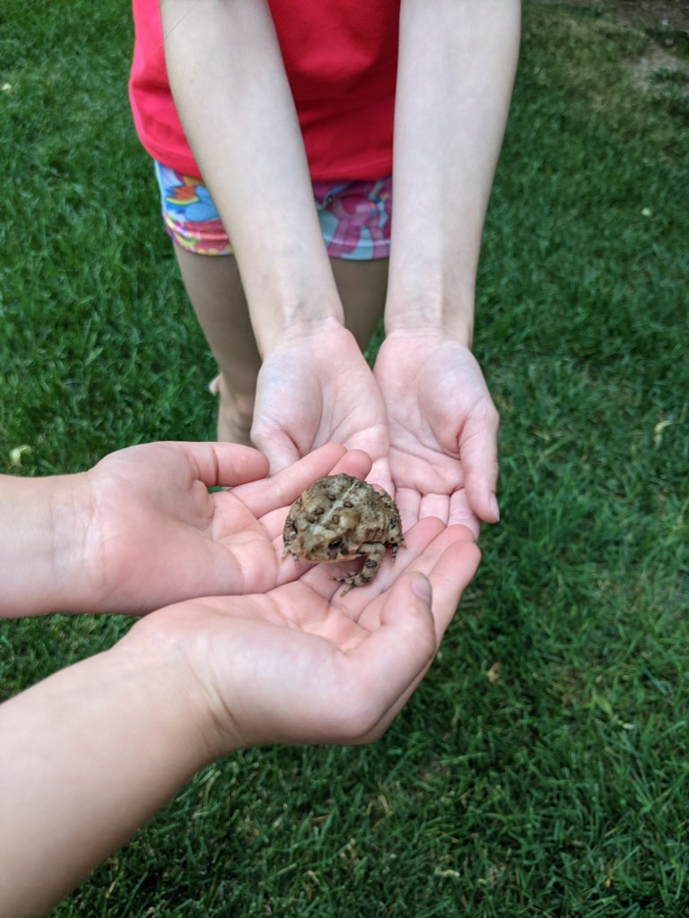 June 7, 2021: School is wrapping up and we’re done with our Old Mother Nature book, but Toad came by for a visit today anyway. It was nice to meet another animal up close that we’ve been learning about. We also saw a mommy raccoon with her five babies on our backyard camera. They visited our patio, but we didn’t get to meet them because we were sleeping. Once we get daddy to agree to a backyard campout, I’m sure we’ll meet them then!