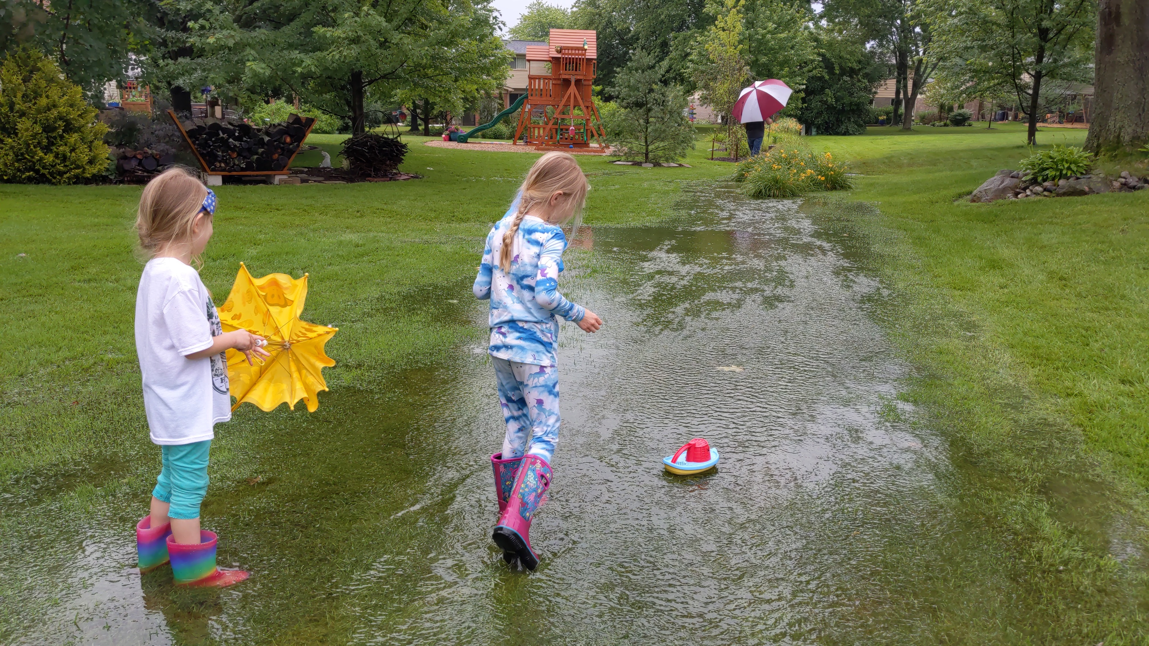 June 25, 2021: It’s a really rainy day, like REALLY rainy! But not to worry, mommy knows how to have fun on rainy days. Go to the pet store to buy our neighbor’s dog a birthday present and play in our new backyard river!