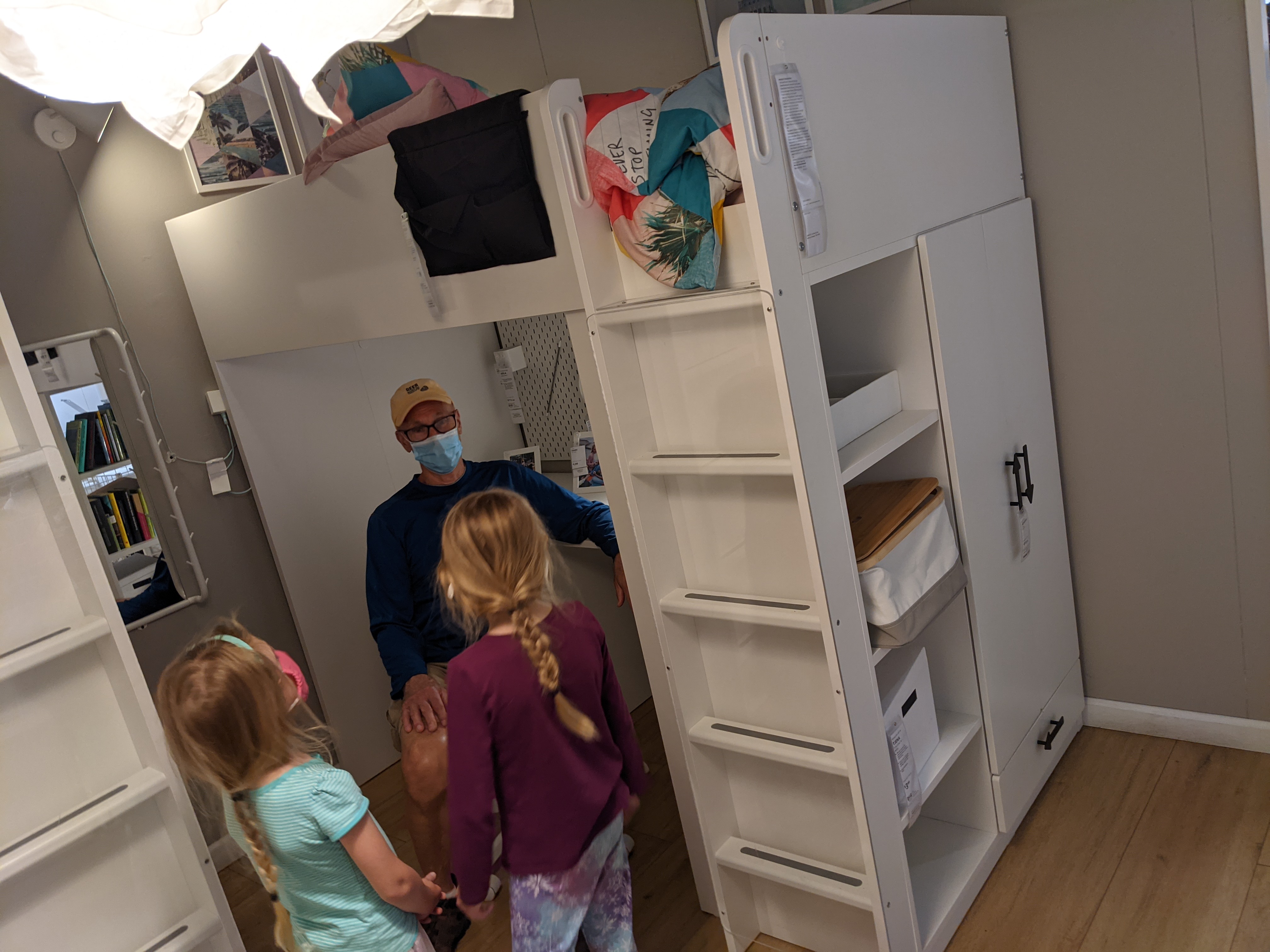 July 12, 2021: If Jameson and I are going to start running successful refreshment stands to raise money for the humane society, we will need better spaces to create our marketing materials. The kitchen table is nice, but sometimes we need a quiet space, alone, to do our best work. Mommy suggested we possibly upgrade our bedroom spaces. Interesting. Turns out there is an amazing store down the road that sells all kinds of cool bedroom stuff and ice cream! We had no idea. Why was mommy keeping this Ikea place a secret from us?!? Oh, what’s that? Mommy says we used to go there all the time before sick week. So weird. We’ve been at home so long, we don’t remember anything we used to do and every trip out is like the first time! Geez. Did this happen to everyone else?
