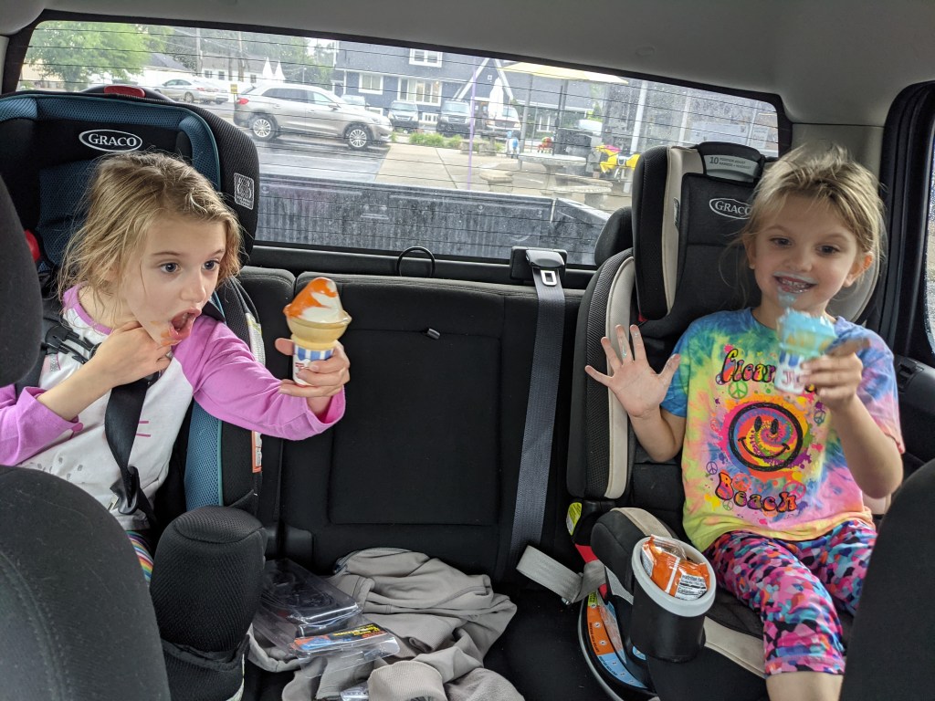 July 13, 2021: We took our minivan to get the rusty paint fixed, but it’s gonna take a few days. Normally that isn’t a problem, but since daddy doesn’t have his new car yet and we only have one car, we needed something. Thankfully, Papa let us borrow his truck! Don’t tell papa, but we ate ice cream inside his truck….