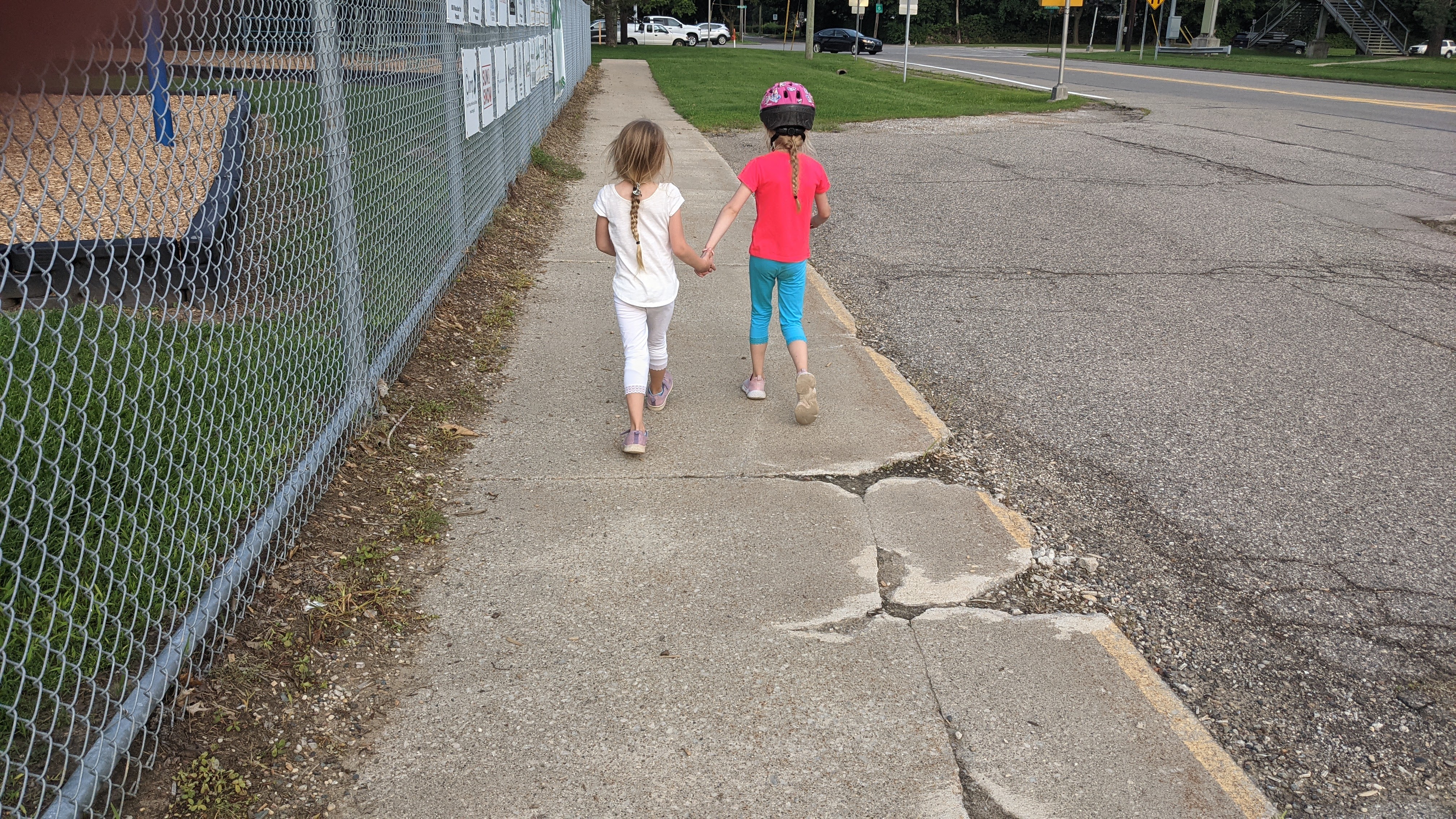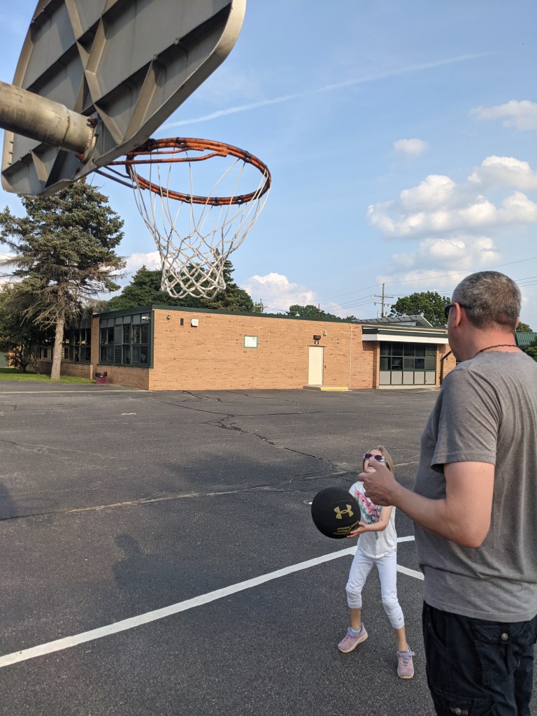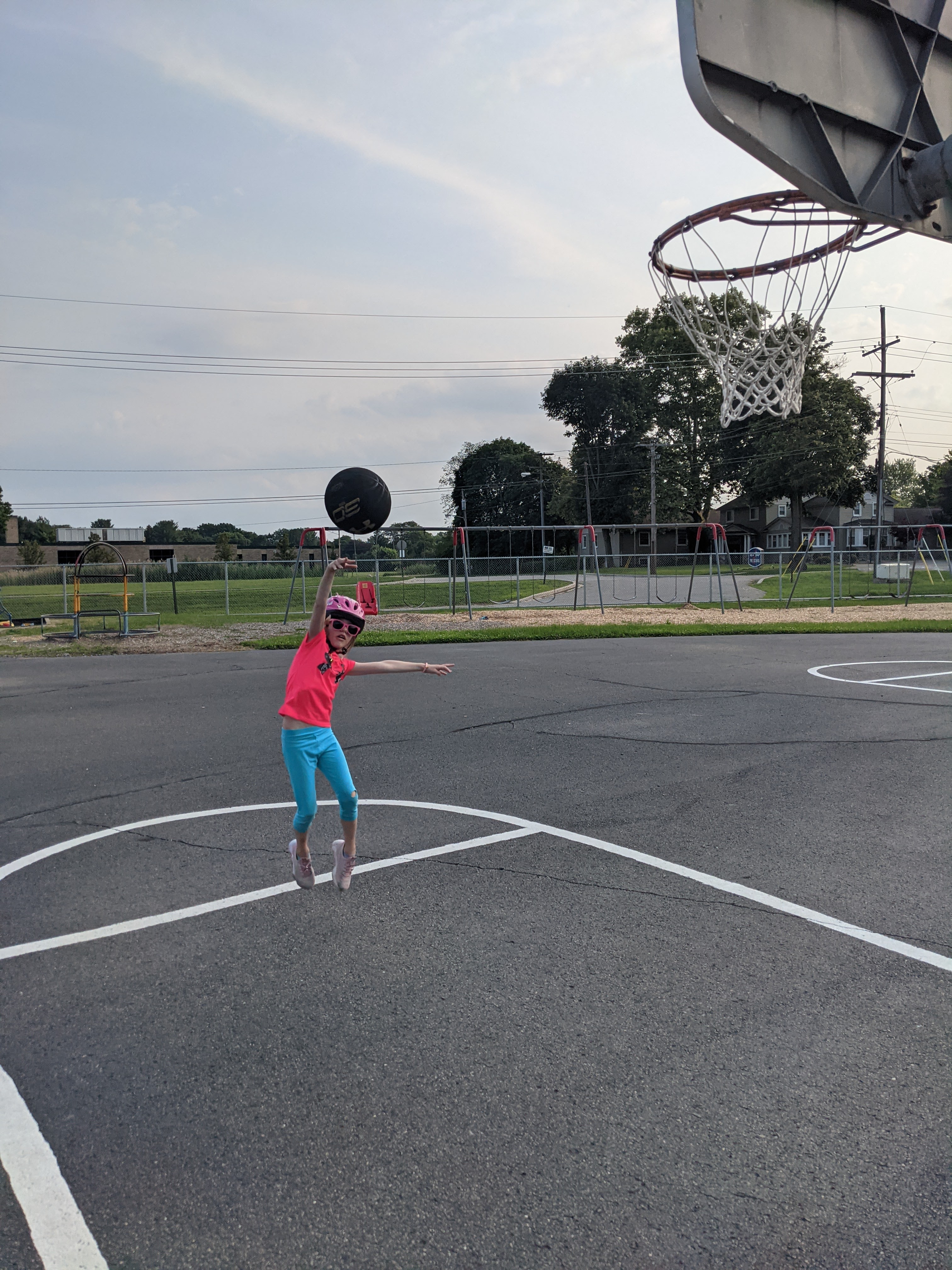 July 28, 2021: One of our favorite things to do is riding our bikes to our new school. We like to park our bikes in the bike racks, cross over the bridge, and play in the playground. I can’t believe we never noticed the basketball hops before! They’re real hoops, but lowered to my height. Today somebody left a basketball behind and we got to shoot around. Finley still couldn’t get the ball in the basket but I made a few. I think I like basketball!