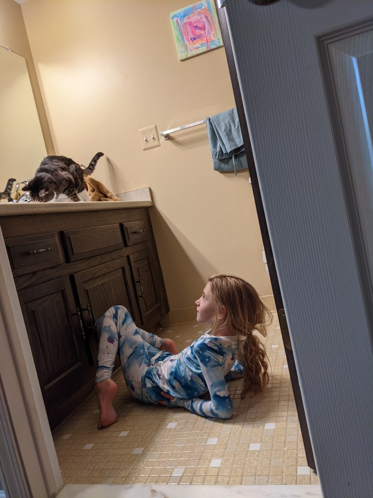 August 16, 2021: Mommy and daddy want to change their bathroom. I like their bathroom. They don’t like the tile. I like the tile. I’m going to miss their bathroom. They went to the tile store tonight to look at the tile mommy likes. I hope the store ran out of what she wants and only has yellowy-orange tile like they already have. When Fin and I get our blue house, we’re totally going to have a bathroom that color.