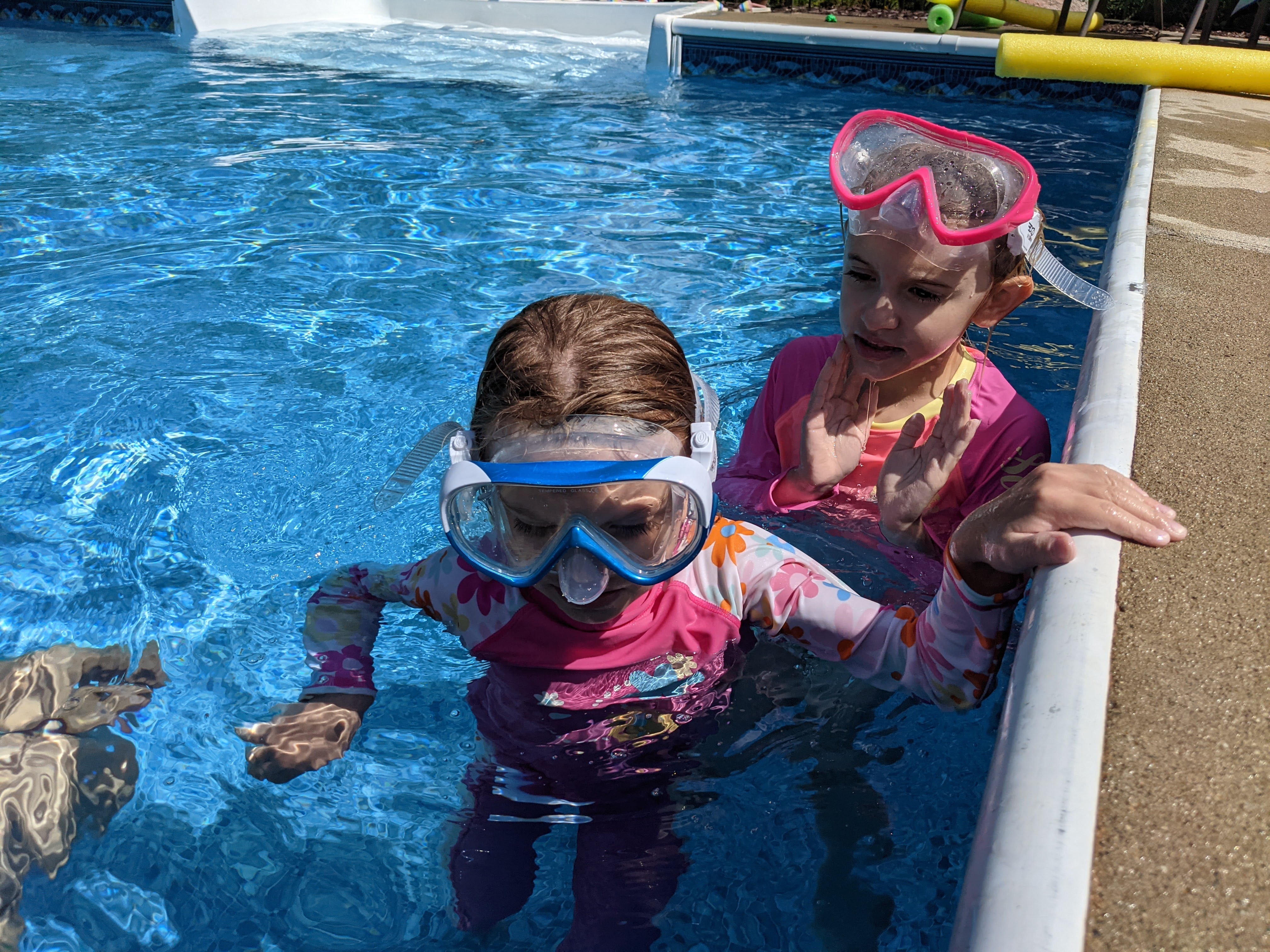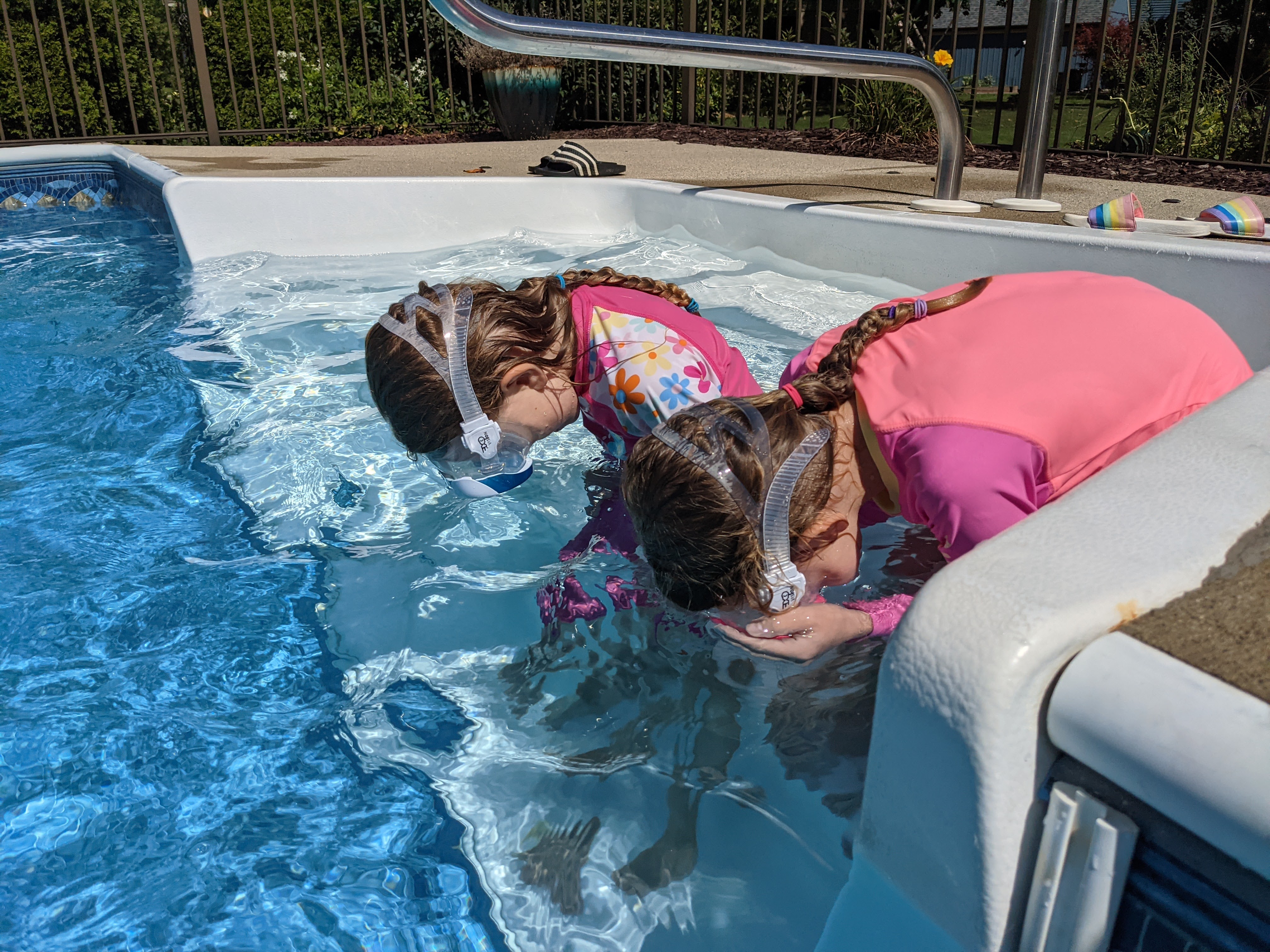 August 29, 2021: Daddy is starting to get better at this have fun before school starts stuff. Today we went swimming in Scott and Chelsea’s pool to test out our new SCUBA masks and biked to get juice at CVS. The water was so warm that mommy even got in! Keep it up, old man!