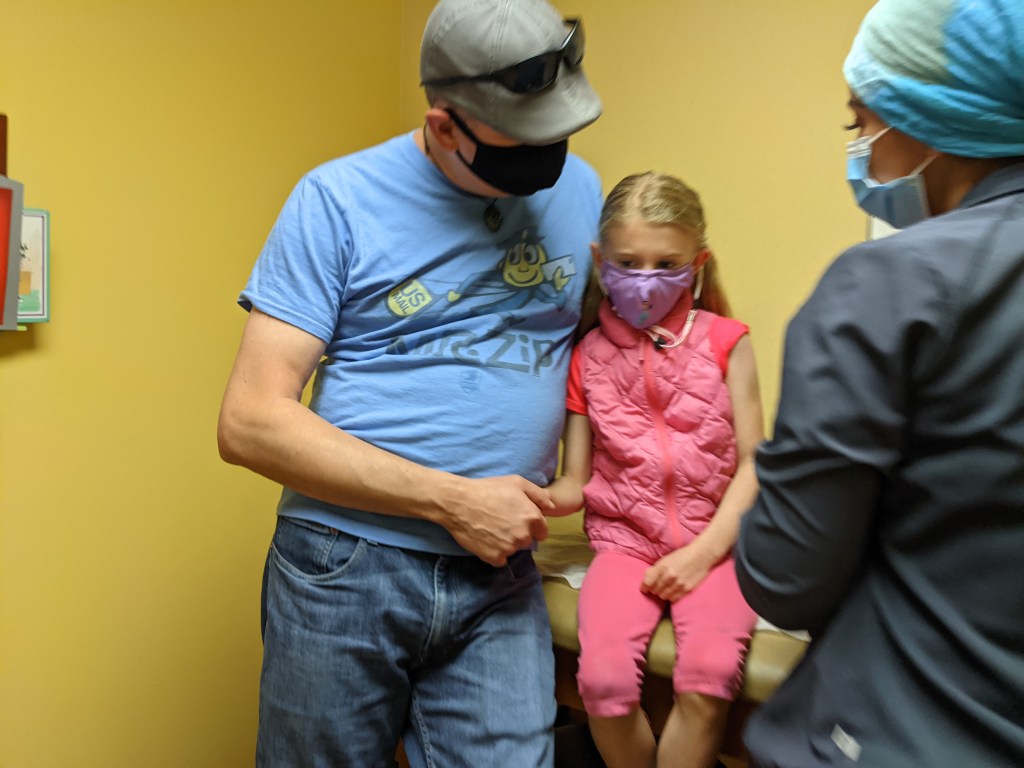 September 16, 2021: Well, we got our flu shots today. And. We. Did. Awesome! Were we nervous? Of course. But, Finley only had one tear and I didn’t cry at all! We are so ready for that covid shot when it’s available. Our reward for doing such a great job was a lollipop, sticker, and then grammie and papa picked us up from school. Yup. We’ve got a process in place. Bring it.