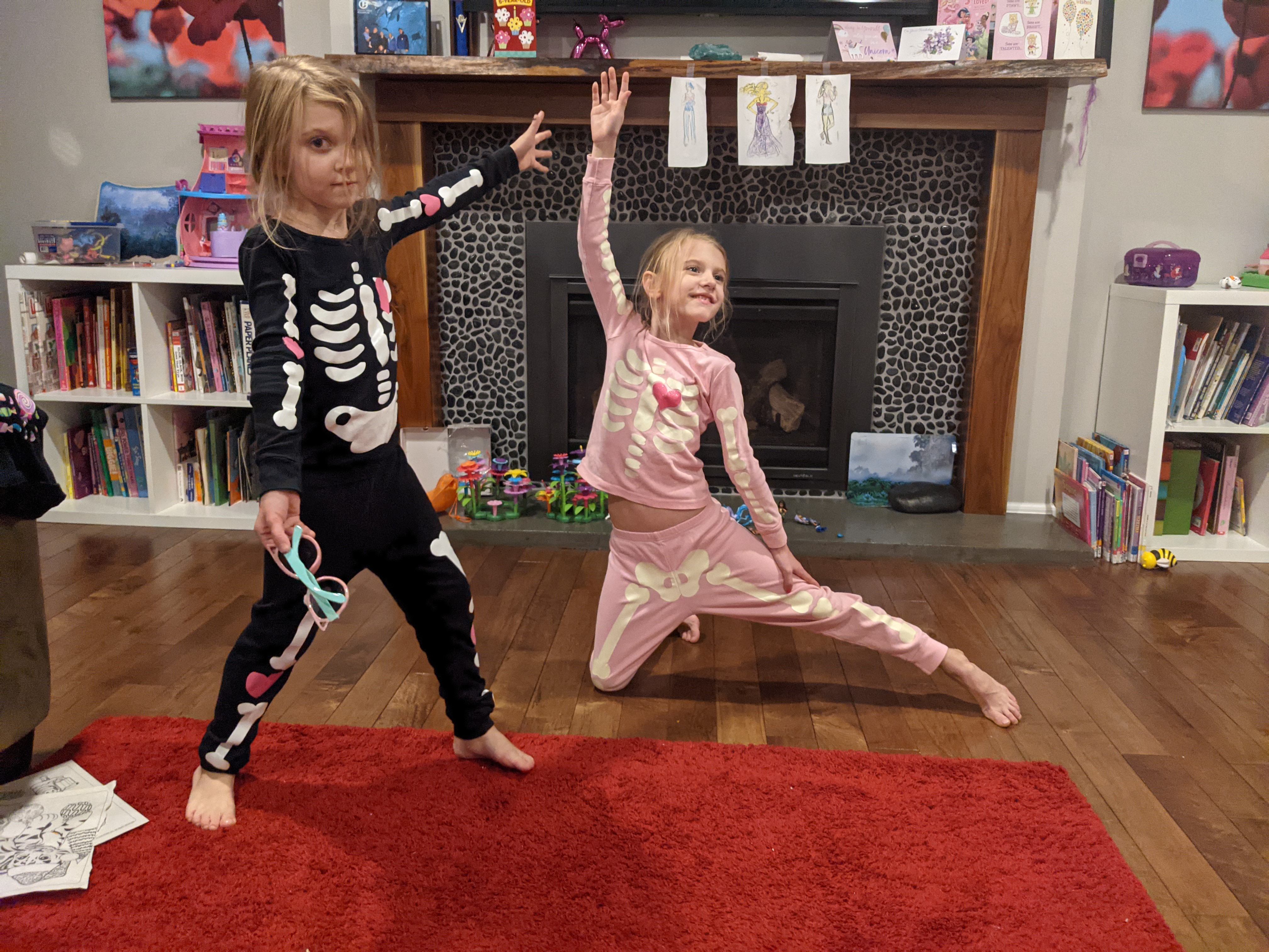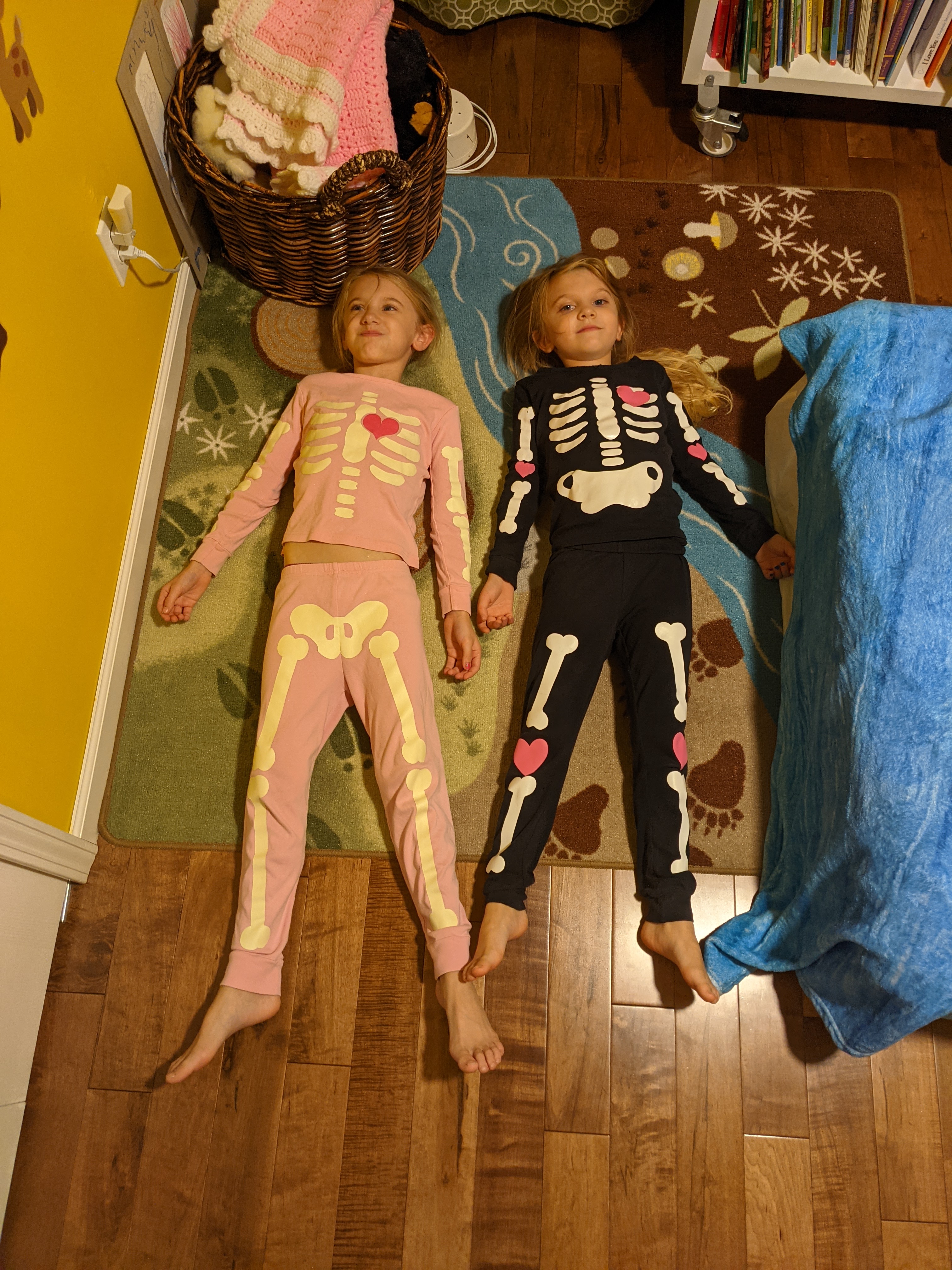 September 24, 2021: I finally got some glow-in-the-dark skeleton pajamas for my birthday. They are super sweet and they are just like Jameson’s. Except mine are black and hers are pink. I’ve been wanting to match her for a while now so we can do skeleton dances in the dark. It’s so goofy, but totally awesome!