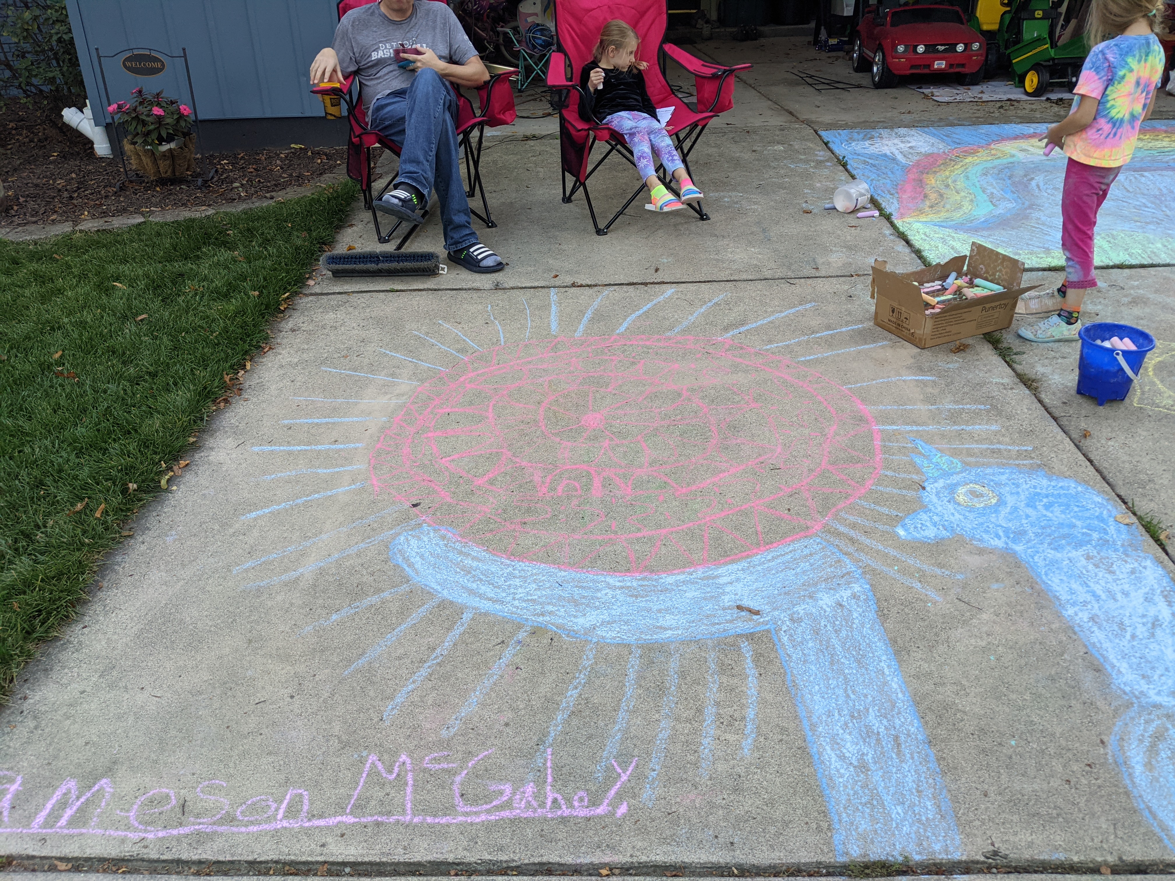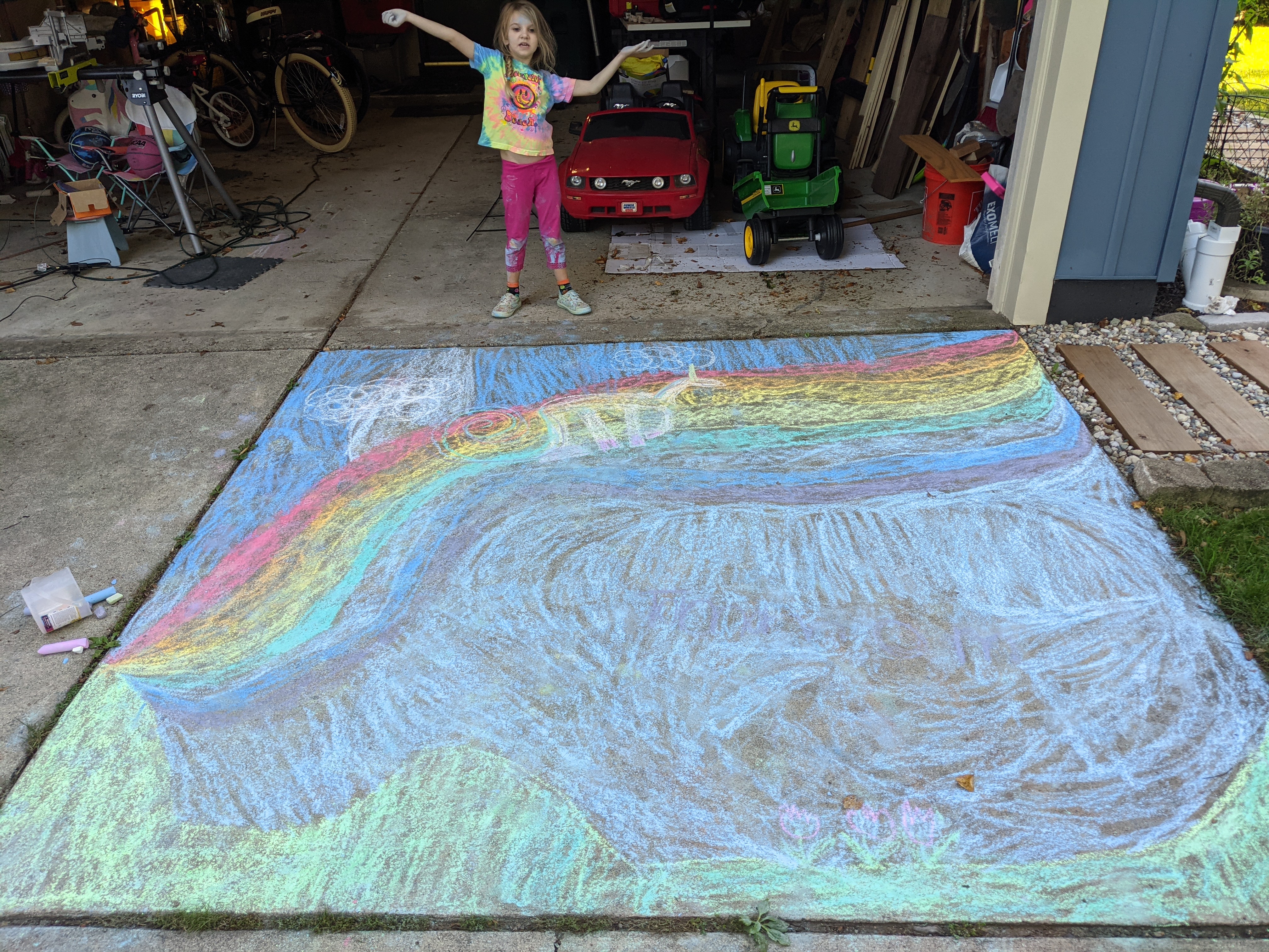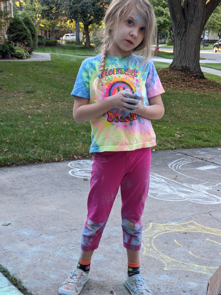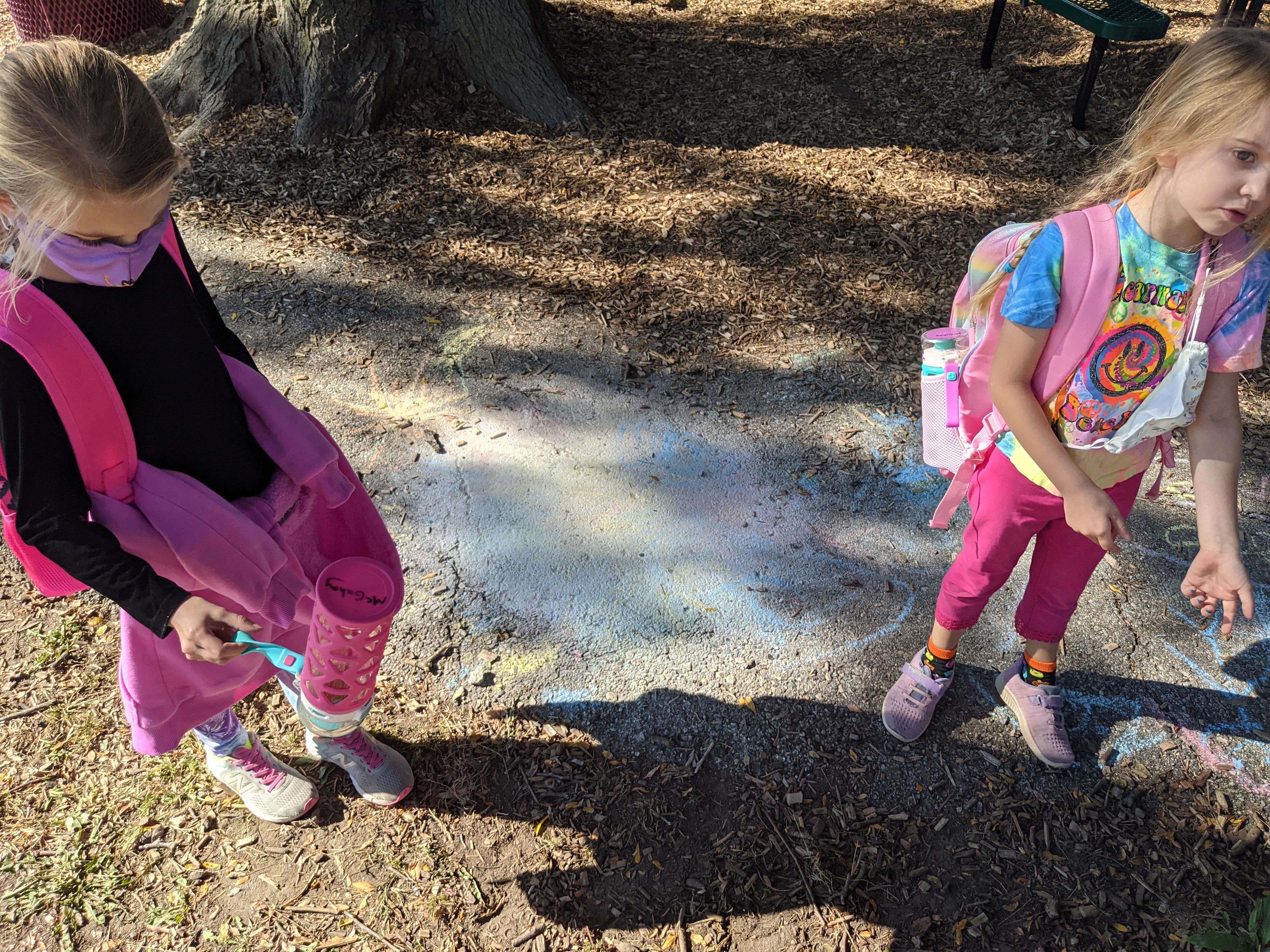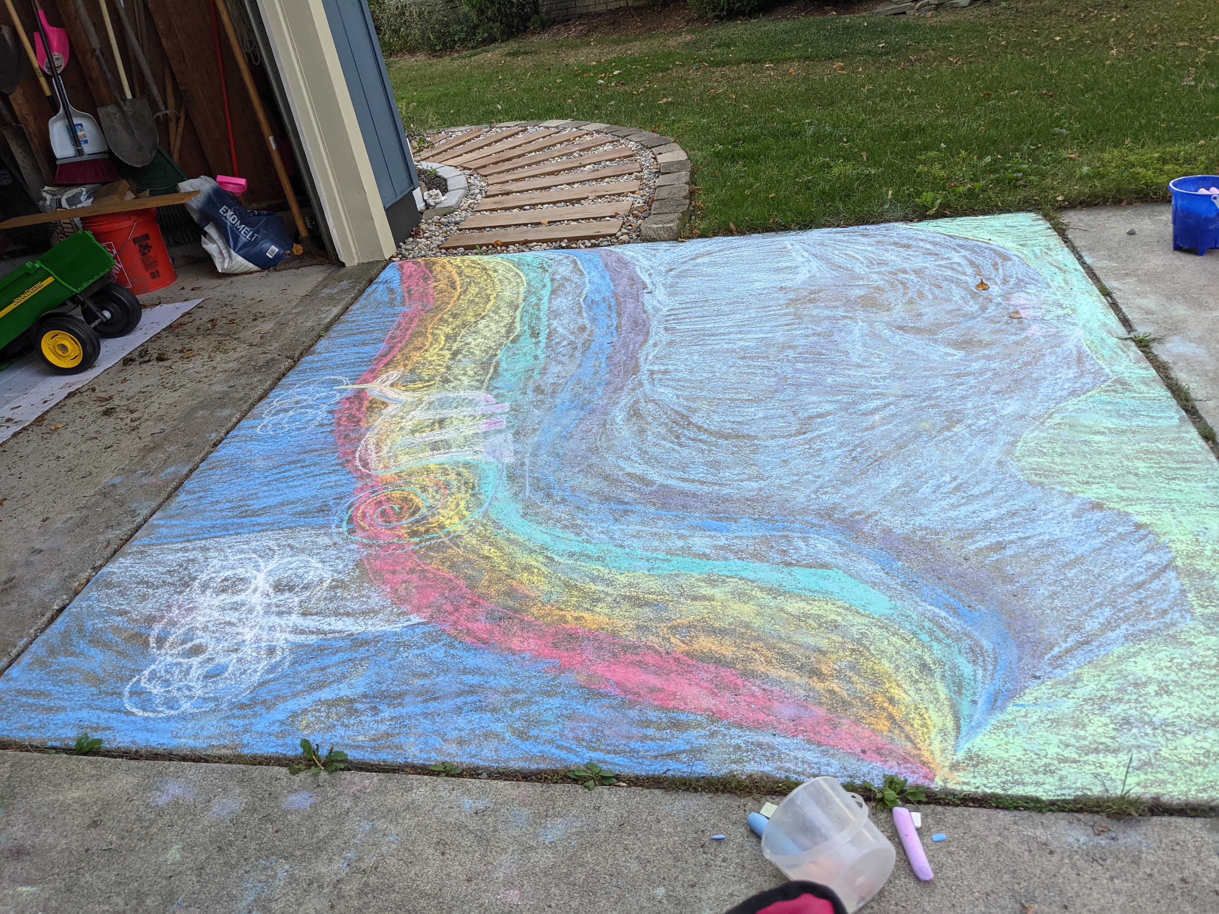 September 29, 2021: The thing I miss most about mommy’s school is all the time I had to make chalk drawings. I did use a little chalk at recess today, but there are only a couple of colors and it was not the same. When I got home, I got out our big box of chalk. Then, I made a secret drawing for mommy on one whole square. She loved it! Also, if you don’t get chalk all over you, are you really even chalk drawing?